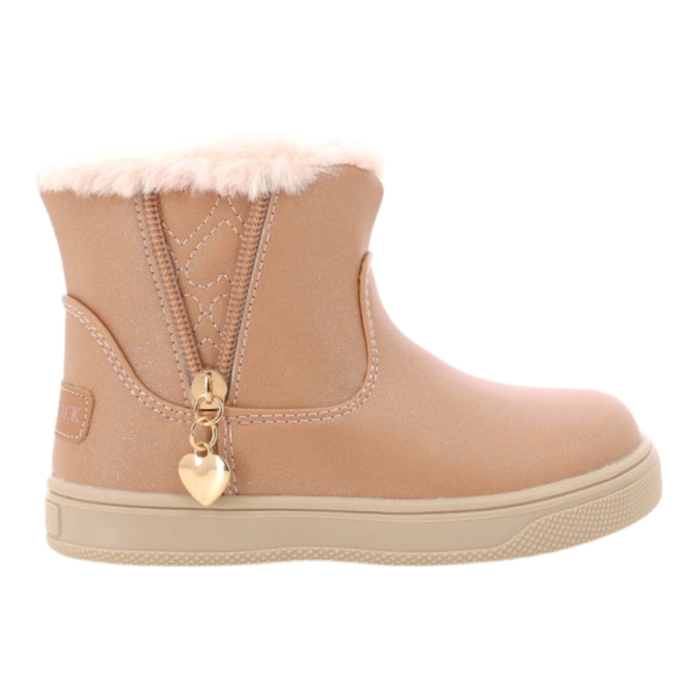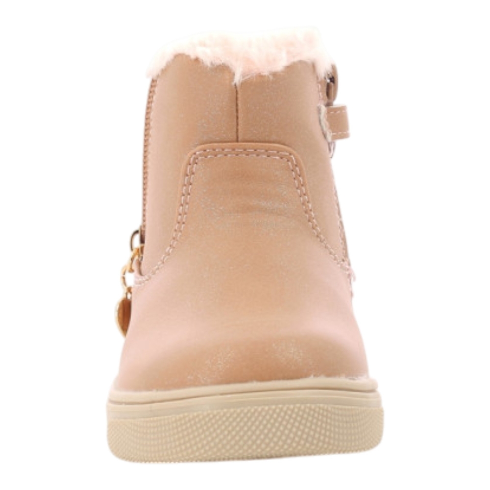 Tronchetto in simil nubuk, chiusura con zip laterale, fettuccia a strappa applicata, profili con pelliccia sintetica a contrasto, suola in gomma.
