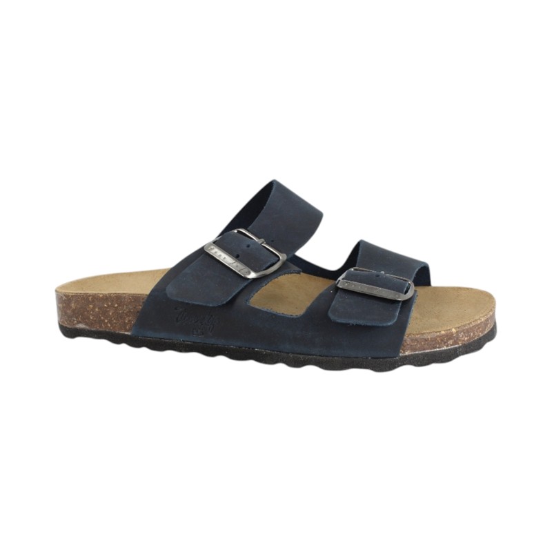 Ciabatta in nubuk, fettucce con fibbi regolabili, sottopiede in pelle scamosciata, suola in gomma e sughero.