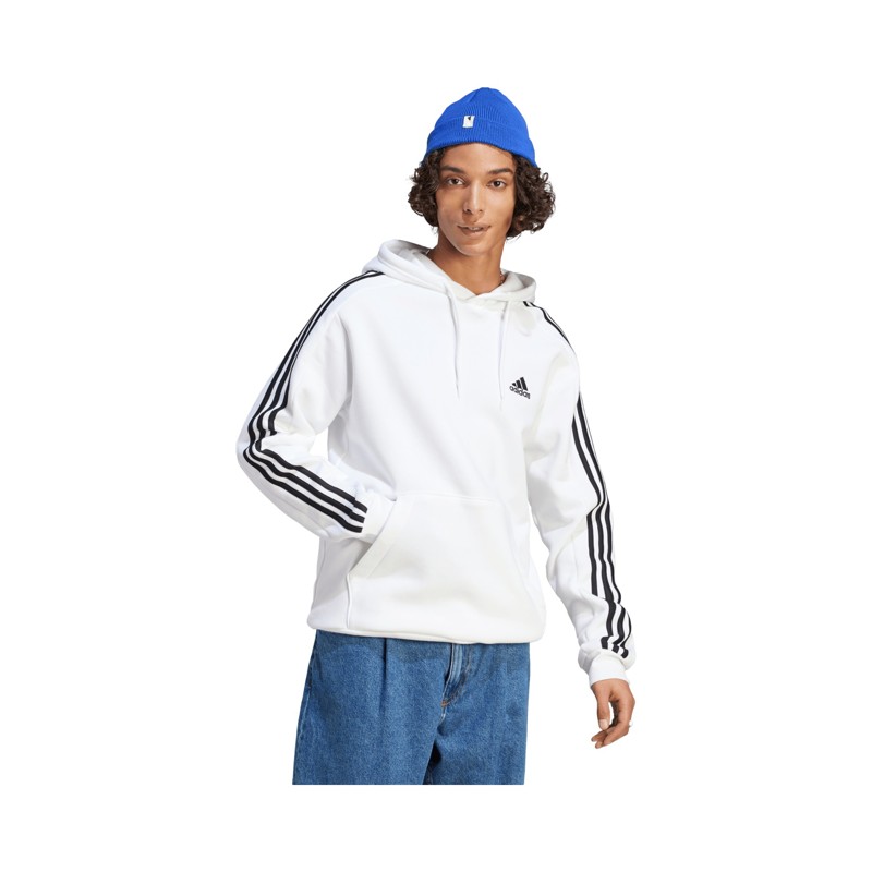 Felpa in cotone, collo con cappuccio e coulisse, spalle regolari, maniche lunghe, stripes laterali a contrasto, logo ricamato a contrasto, tasca a marsupio, orlo dritto.