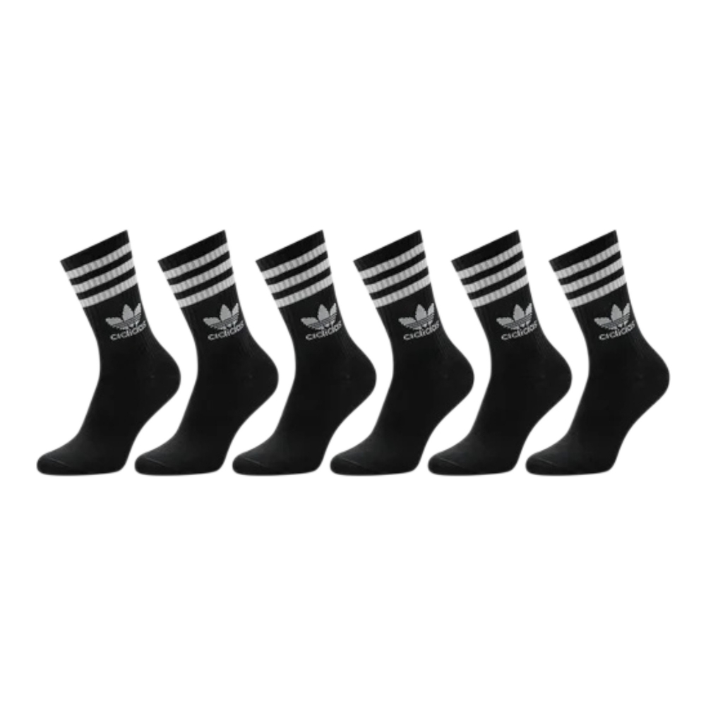 Set 6 calze in cotone, iconiche 3 stripes a contrasto, logo trifoglio, orlo dritto.