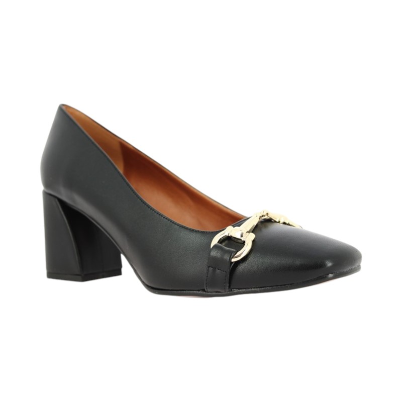 Decolletè in similpelle, punta tonda, dettaglio decorativo in metallo, sottopiede in vera pelle, tallone rinforzato, tacco quadrato.