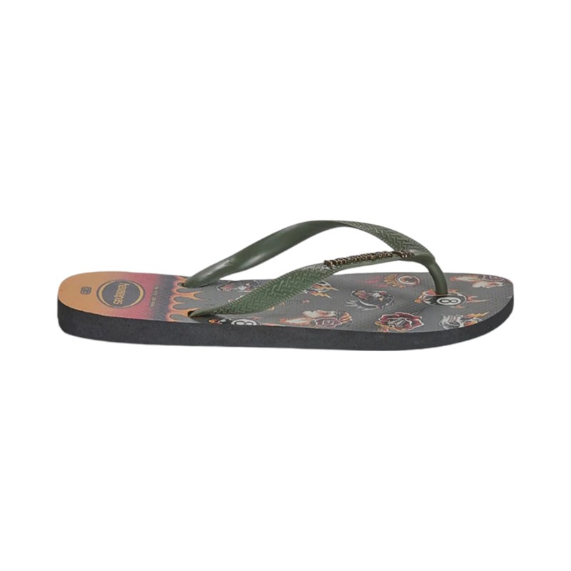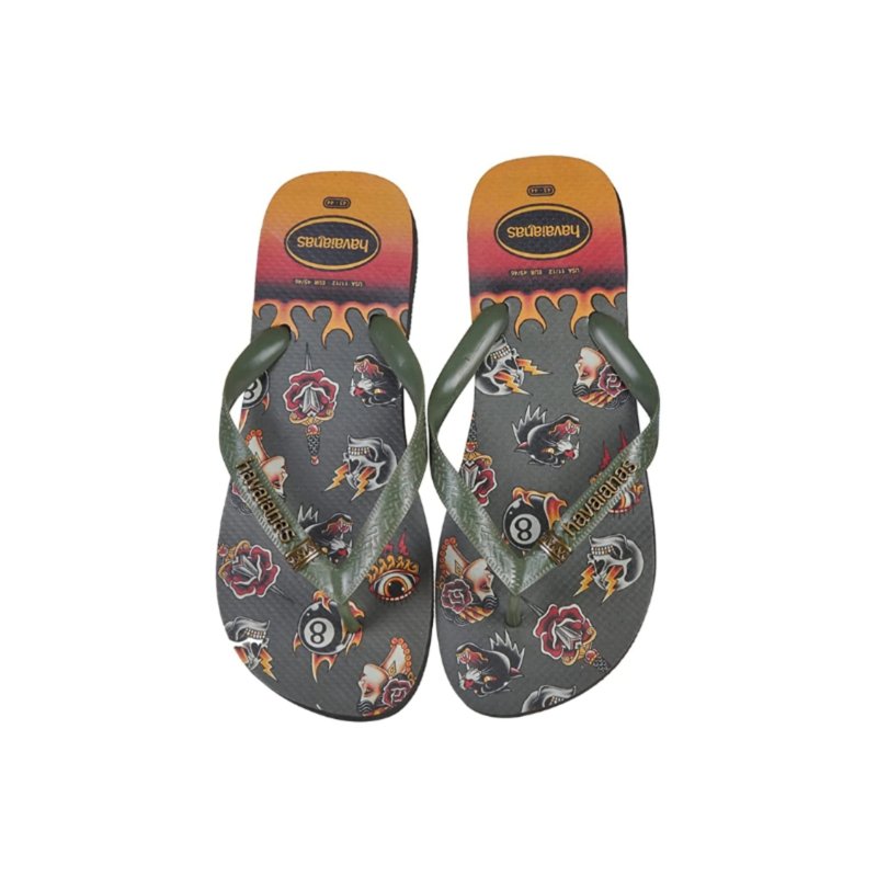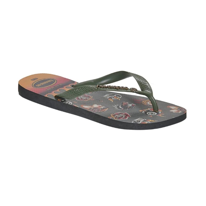 Infradito in gomma con stampa tatuaggi old style, fettucce in PVC con logo inciso.