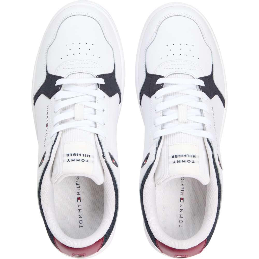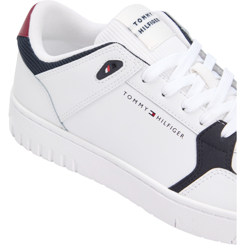 Sneakers in vera pelle ispirate al mondo del basket, sono ideali per aggiungere un pizzico di originalità ai tuoi outfit, interni in tessuto sintetico, suola antiscivolo sottile in gomma, fori per la ventilazione sull'esterno, linguetta in tessuto a costine con patch logo a contrasto, chiusura con lacci, tallone con bandierina Tommy Hilfiger gommata.
