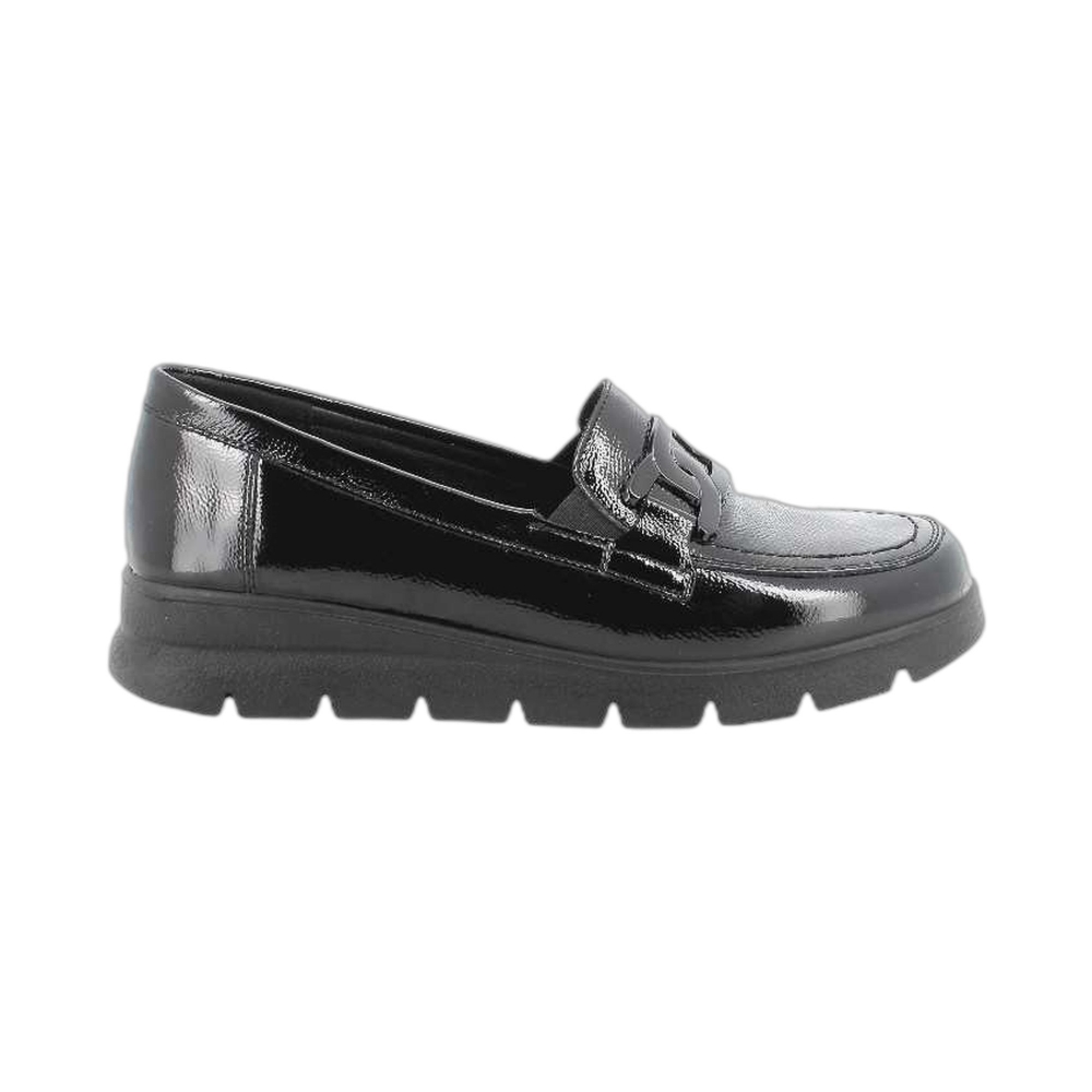 Mocassino in similpelle verniciata, punta tonda, mini bande laterali elasticizzate, dettaglio in metallo applicato, punta tonda, tallone rinforzato, suola in gomma.