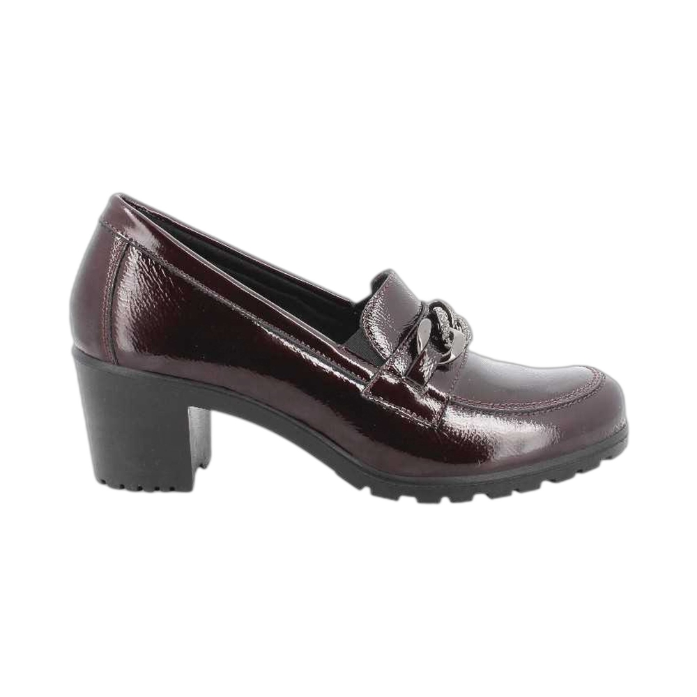 Mocassino comfort in similpelle verniciata, punta tonda, linguetta con dettaglio in metallo intrecciato, tallone rinforzato, tacco comfort.