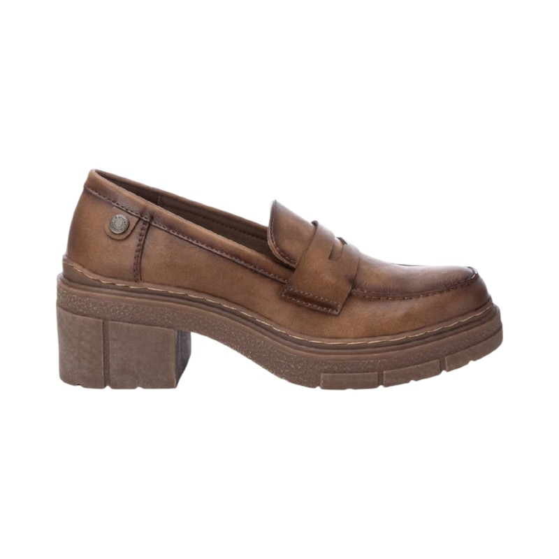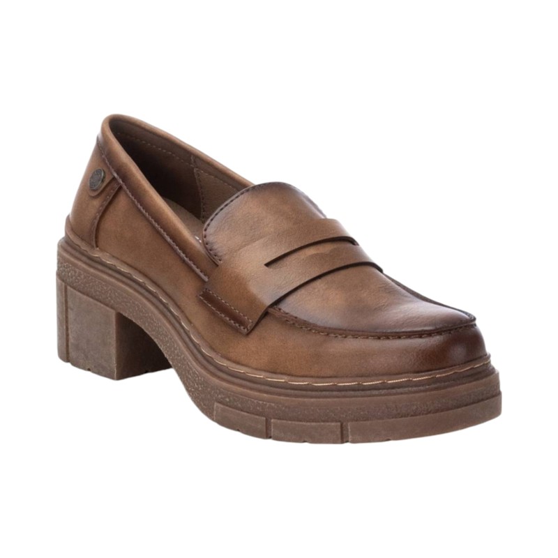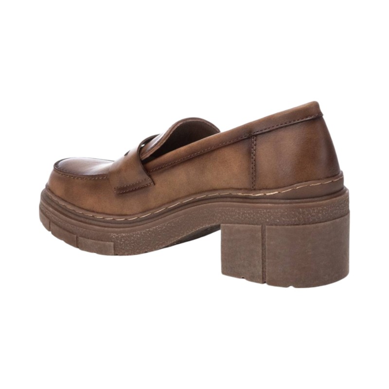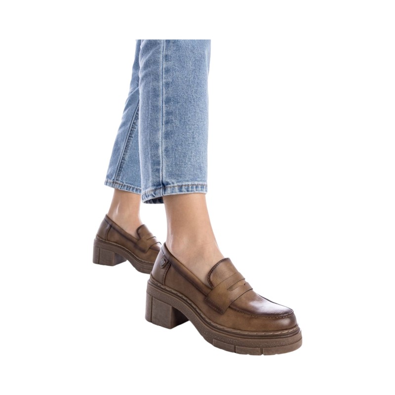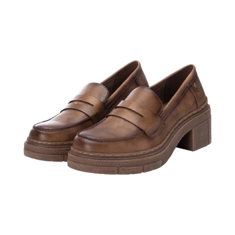 Mocassino in vera pelle, vaschetta in rilievo, linguetta, fettuccia applicata, tallone rinforzato, suola con tacco quadrato.