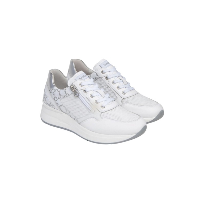 Sneakers in vera pelle e mesh, dettagli laterali in tessuto spalmato con lettering logo a contrasto, dettaglio posteriore in pelle laminata, zip decorativa laterale, suola in gomma.