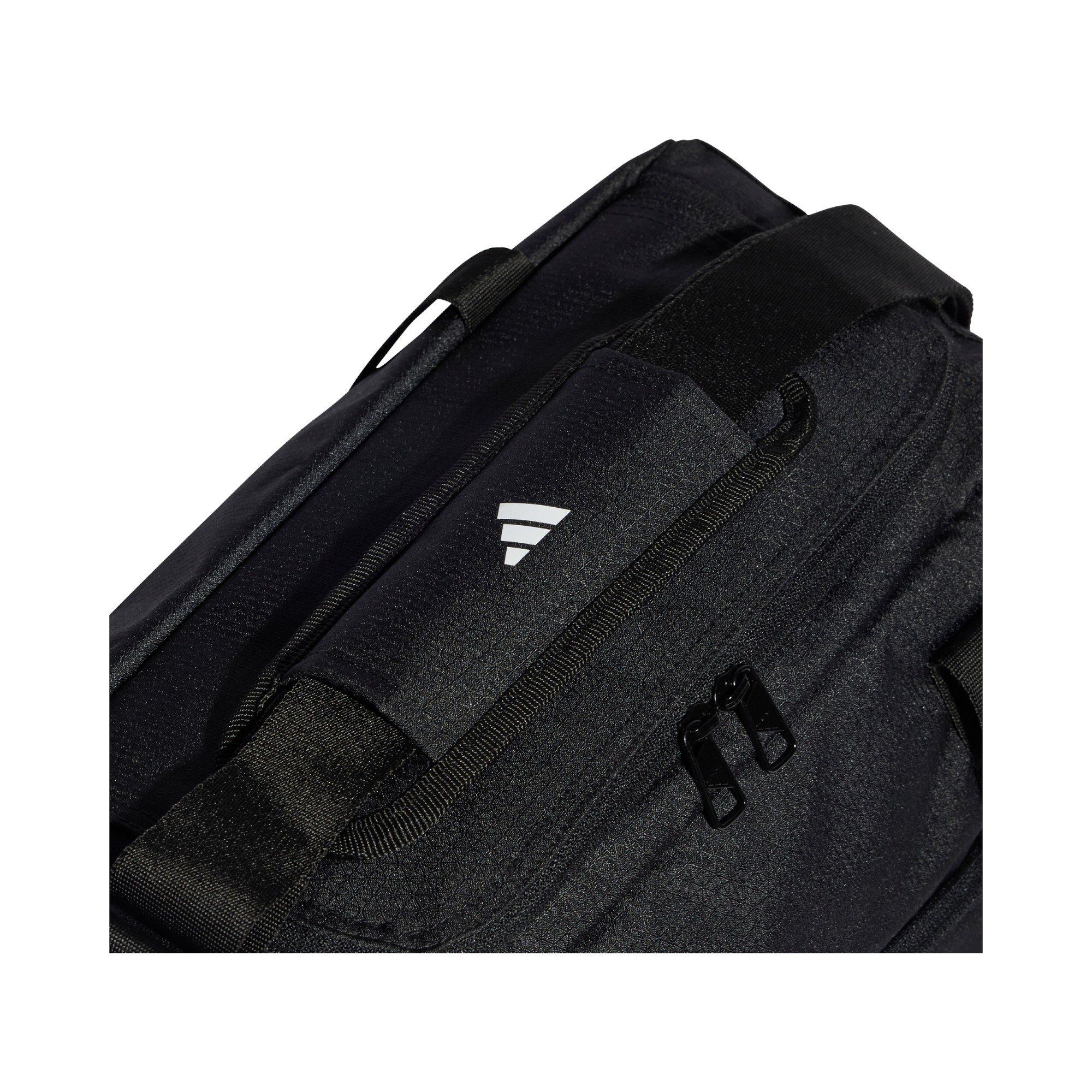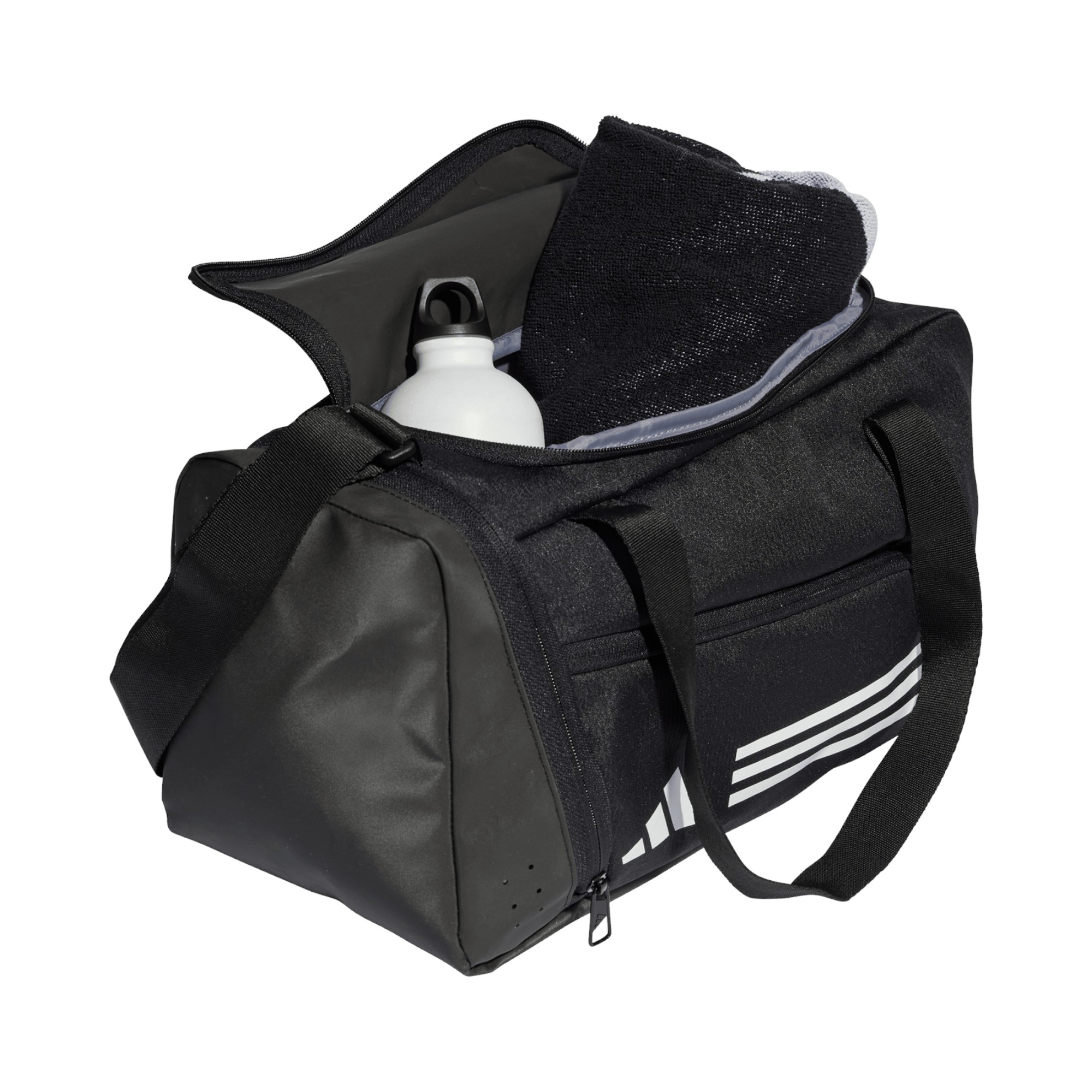Borsone in tessuto sintetico, tasca anteriore con zip e stripes a contrasto, tasca laterale con zip, chiusura con zip, doppi manici.