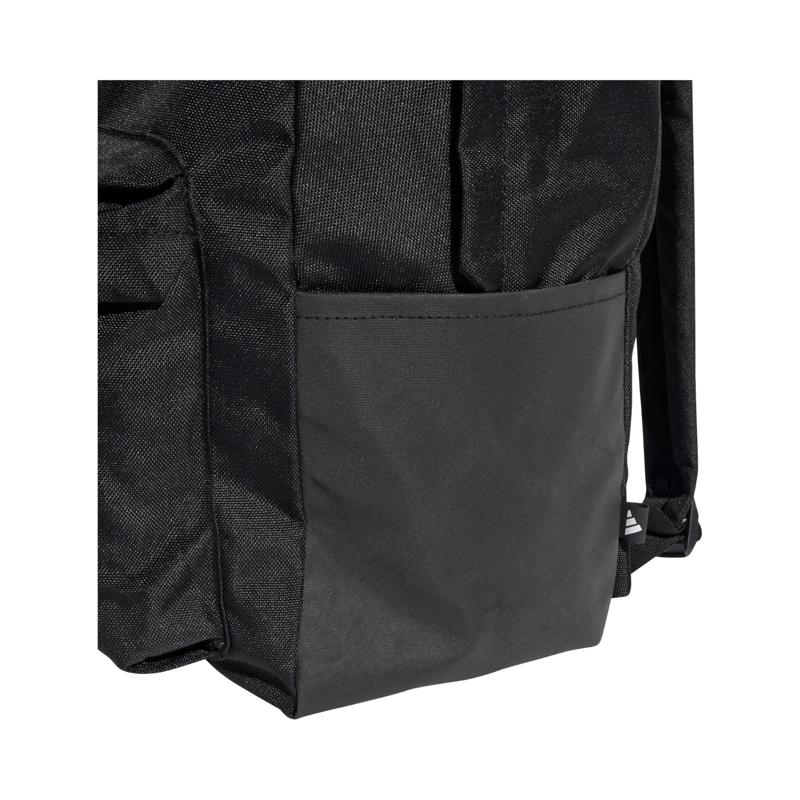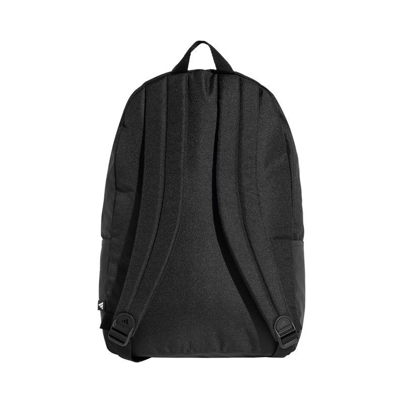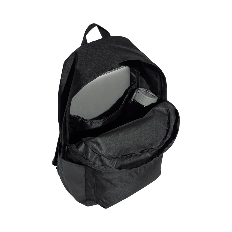 Zaino in tessuto nylon, tasca anteriore con zip, logo trifoglio laminato, chiusura con zip a doppio cursore, spallacci posteriori regolabili.