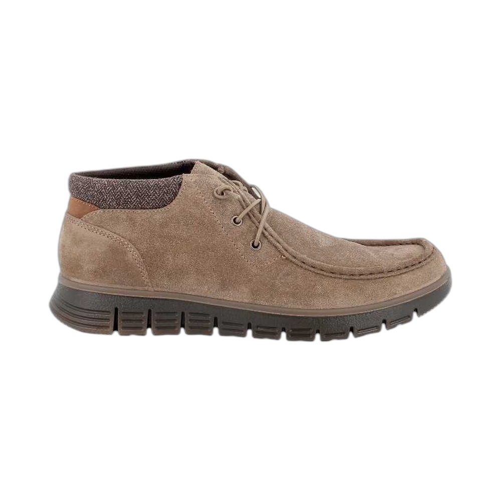 Polacchino in camoscio, linguetta, chiusura con lacci, punta tonda, tallone rinforzato, suola in gomma.