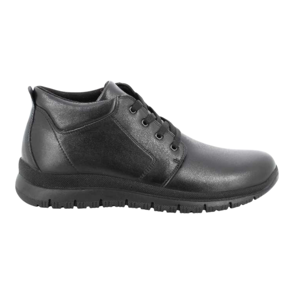 Polacchino in vera pelle, punta tonda, linguetta, chiusura con lacci, tallone rinforzato, suola in gomma.