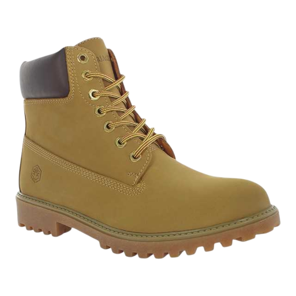 del marchio, unendo robustezza, comfort e design intramontabile. Realizzati in morbido nabuk, si distinguono per la loro texture vellutata e la capacità di resistere nel tempo senza rinunciare alla morbidezza. Il taglio alto sostiene la caviglia offrendo stabilità, mentre la suola in gomma spessa e antiscivolo garantisce aderenza su ogni superficie, rendendoli ideali per la stagione invernale. I dettagli a contrasto e la tonalità calda del giallo conferiscono un carattere deciso e moderno, perfetto per completare look casual e outdoor.