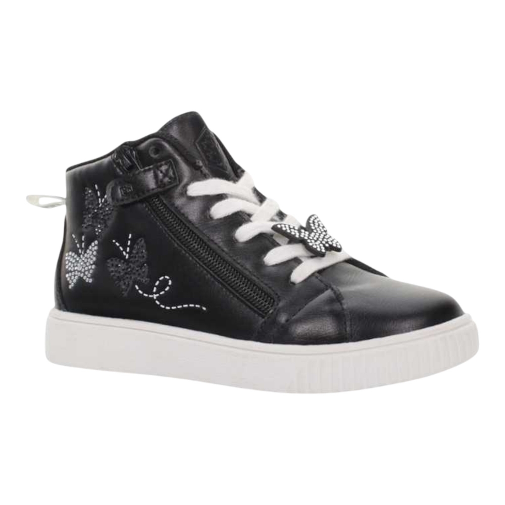 Polacchino in similpelle, linguetta con patch logo, chiusura con lacci, dettaglio con strass applicati, punta tonda, tallone rinforzato, suola in gomma.