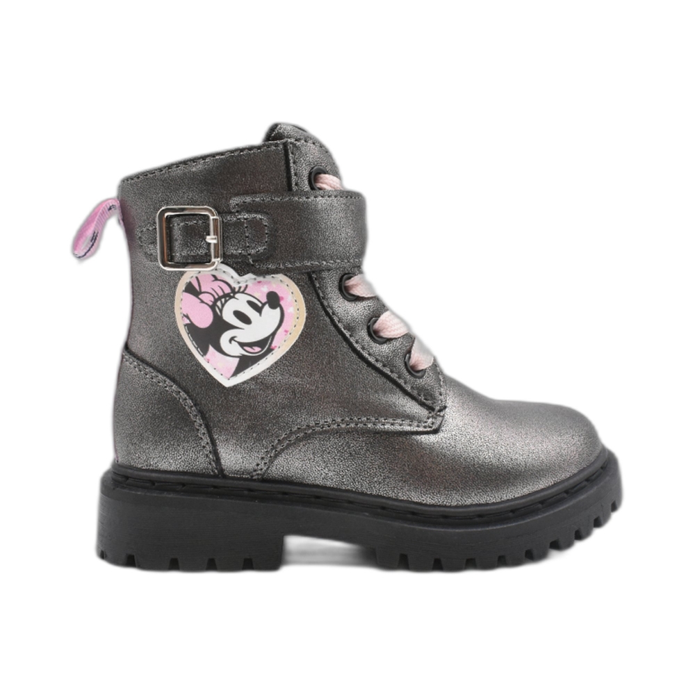 Polacchino in similpelle, linguetta, chiusura con lacci, fettuccia con fibbia, patch laterale di Minnie, tirante posteriore, suola in gomma a trattore.
