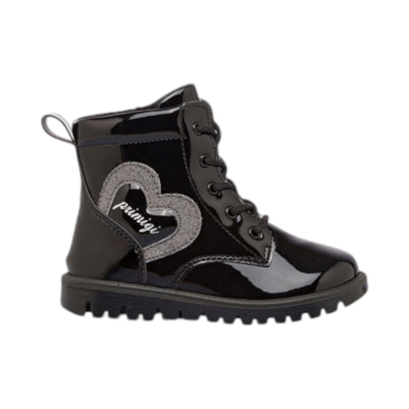 Anfibi in similpelle verniciata, linguetta, chiusura con lacci e zip laterale, cuore in glitter con logo, tirante posteriore, punta tonda, tallone rinforzato, suola in gomma.