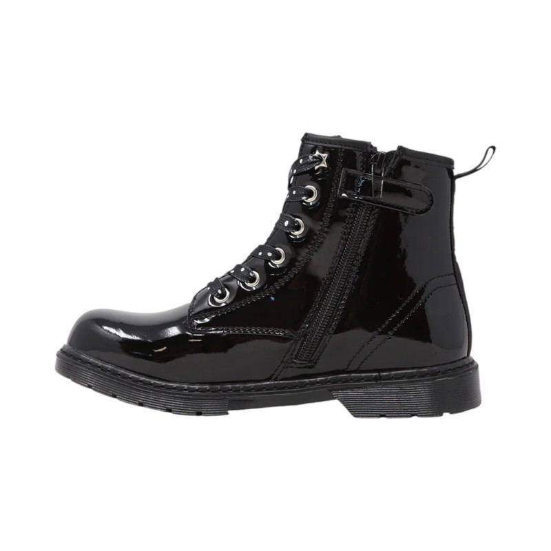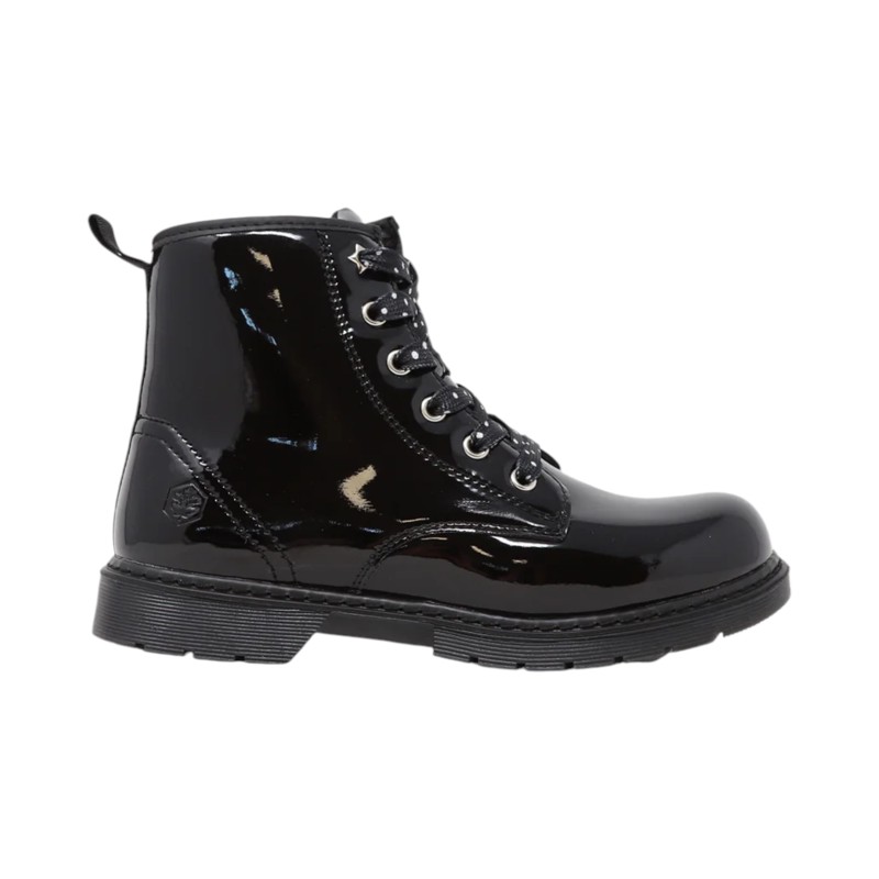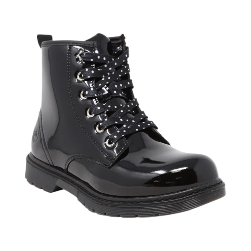 Anfibi in similpelle verniciata, linguetta, chiusura con lacci con motivo a pois, punta tonda, chiusura con zip laterale, suola in gomma.