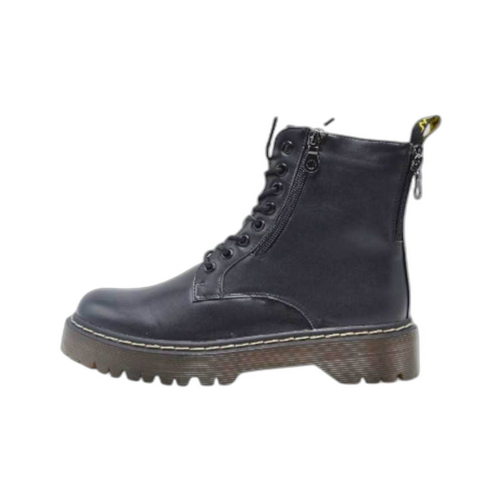 Anfibi in similpelle, linguetta, chiusura con lacci, zip laterali, punta tonda, tallone rinforzato, tirante posteriore, suola in gomma.