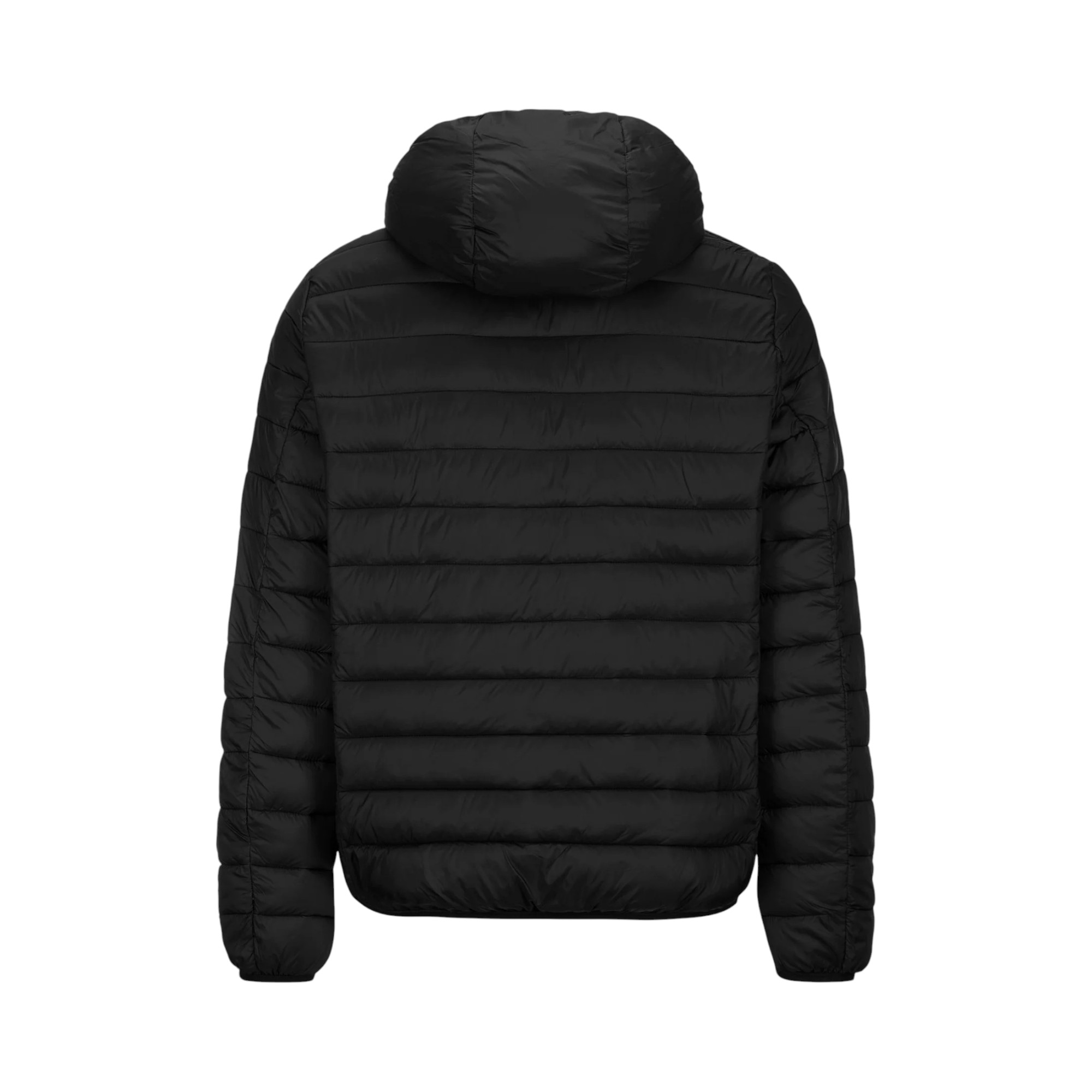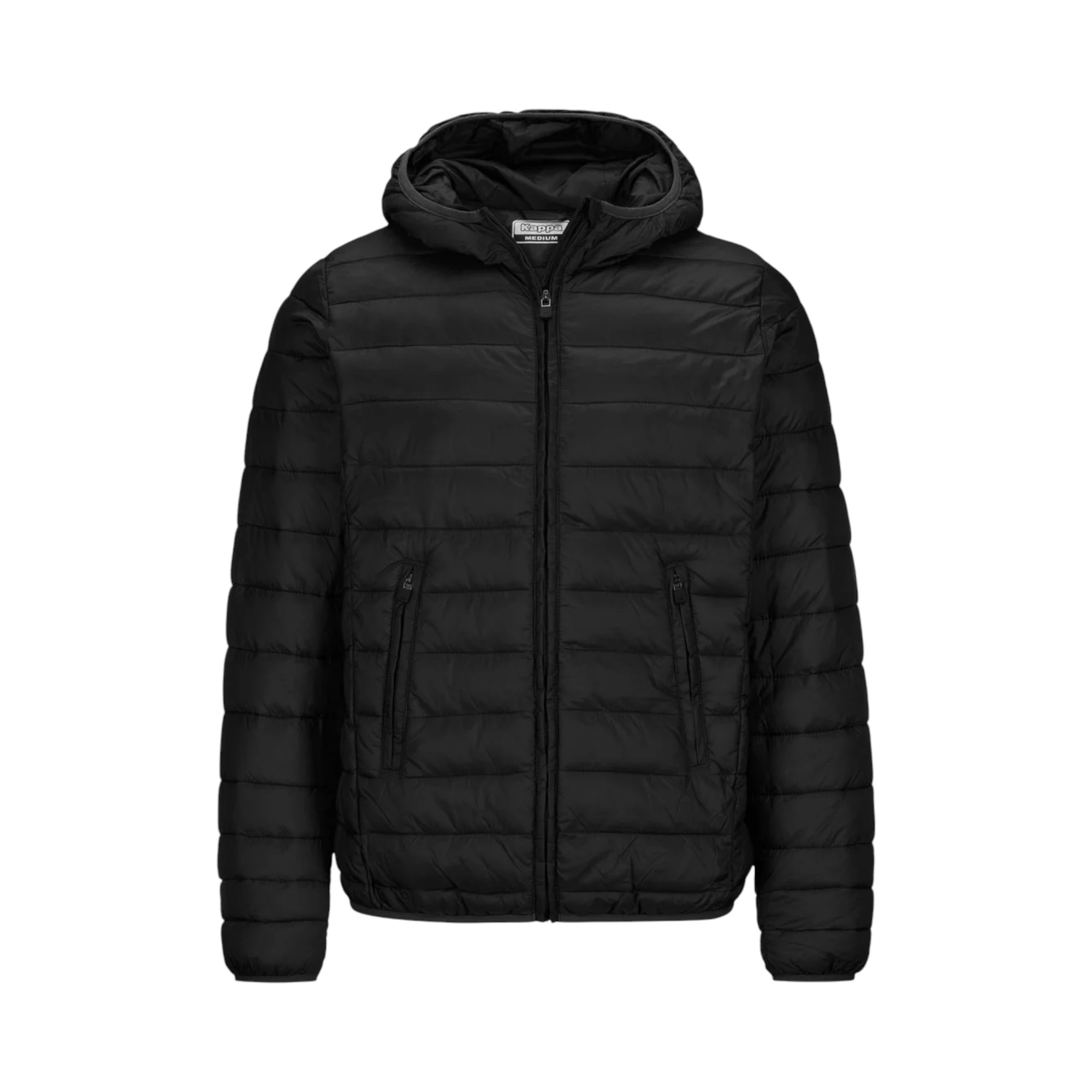 Giubbotto in nylon trapuntato imbottito, collo con cappuccio, spalle regolari, maniche lunghe, 2 tasche con zip, orlo dritto.