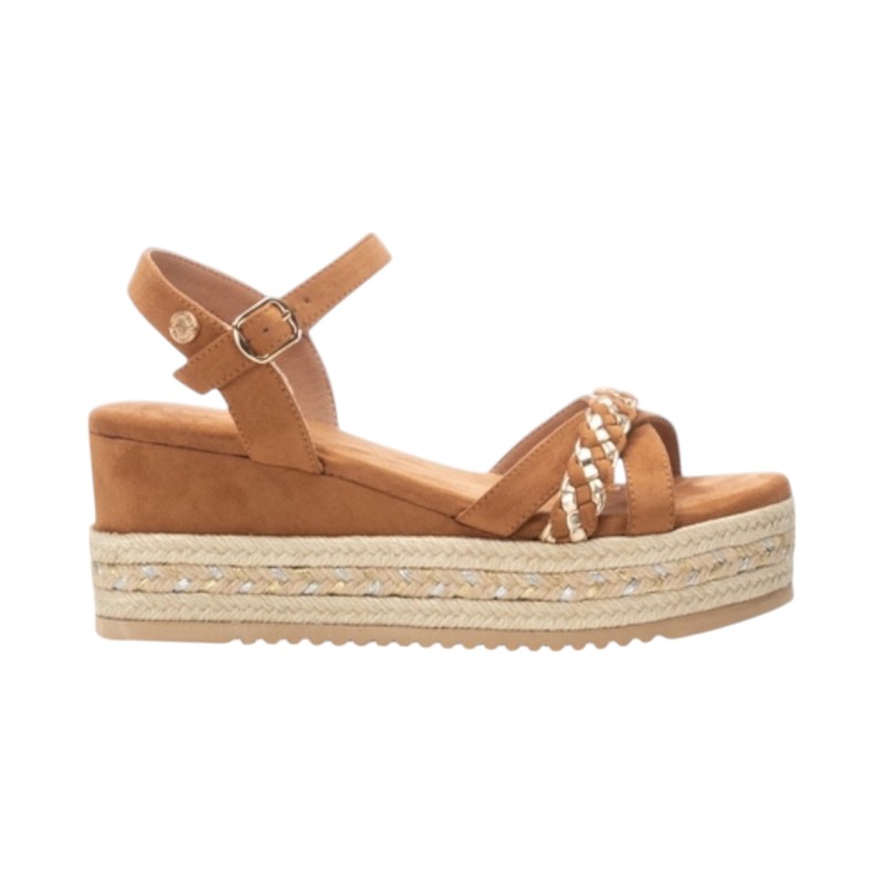 Sandalo in similpelle scamosciata, fascia con fettucce, cinturino alla caviglia con fibbia, suola con zeppa e dettagli in rafia.