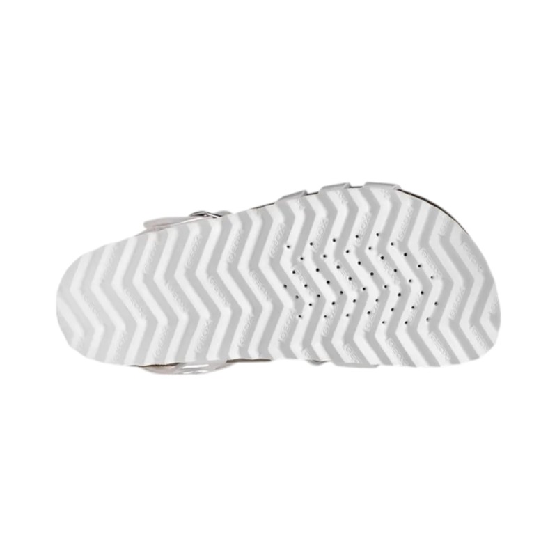 Sandalo in similpelle verniciata, 3 fettucce, cinturino alla caviglia con fibbia regolabile, sottopiede scamosciato realizzato con tecnologia Respira, suola in gomma e sughero.