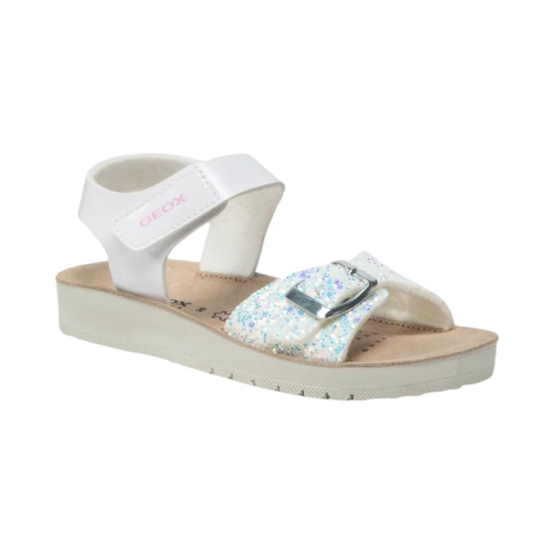 Sandalo in tessuto glitter con profilo iridescente, fascia in velcro con fiocco con strass, cinturino alla caviglia in velcro, suola in gomma.