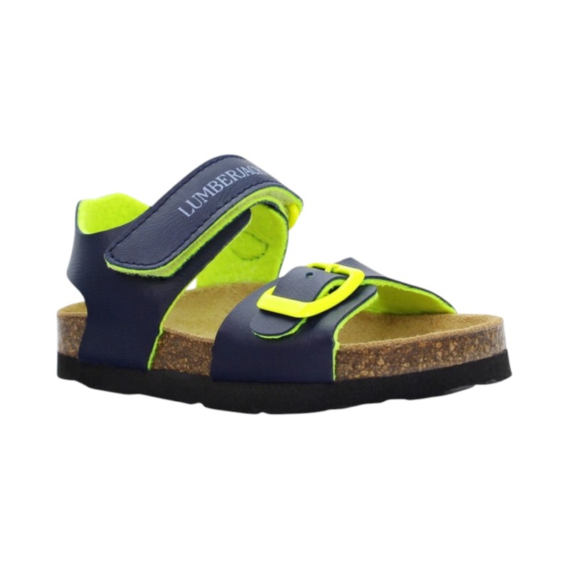 Sandalo in similpelle, fascia con fibbia regolabile, cinturino alla caviglia in velcro con logo a contrasto, sottopiede in camoscio, suola in gomma e sughero.