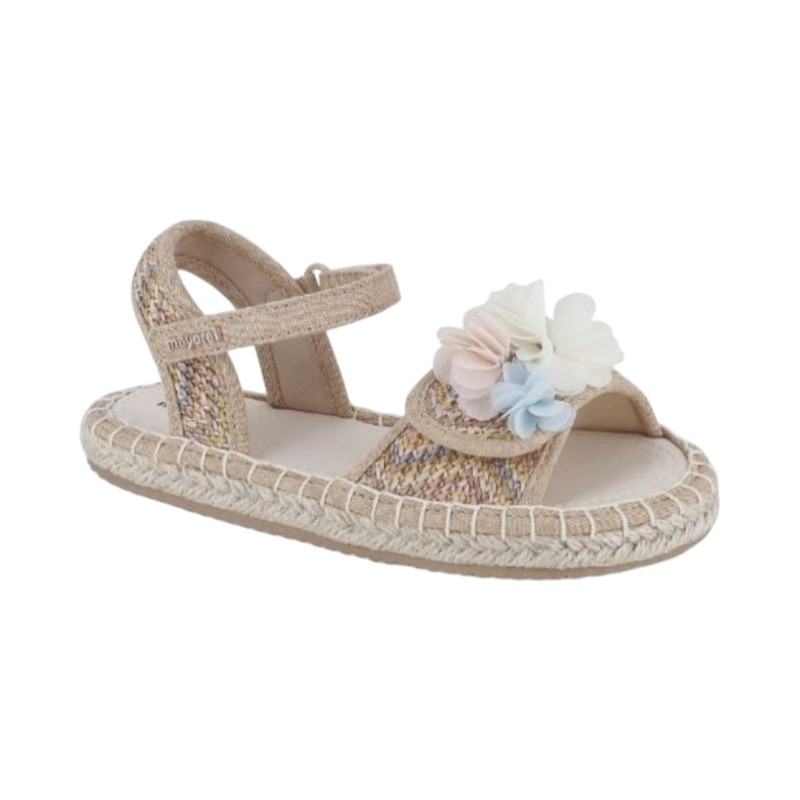 Sandalo in rafia, fascia in velcro con patch floreali applicate, cinturino alla caviglia in velcro con logo in metallo, suola in gomma.