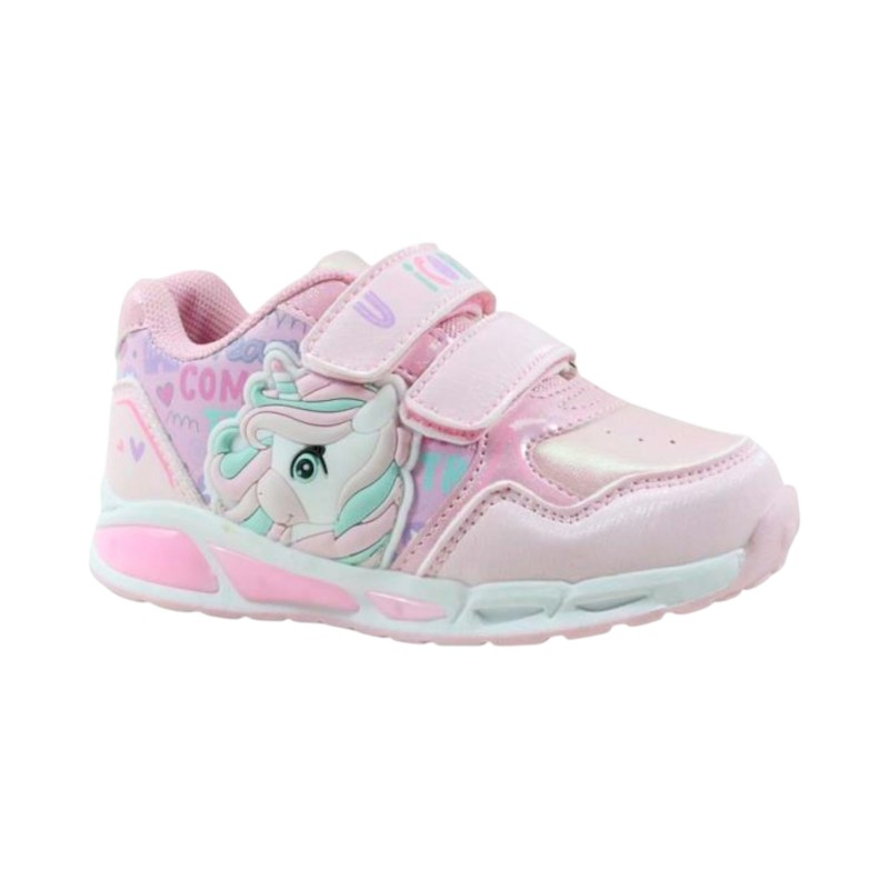 Sneakers con tomaia in similpelle iridescente, patch unicorno laterale a contrasto, linguetta, 2 fettucce in velcro, suola antiscivolo in gomma con luci.
