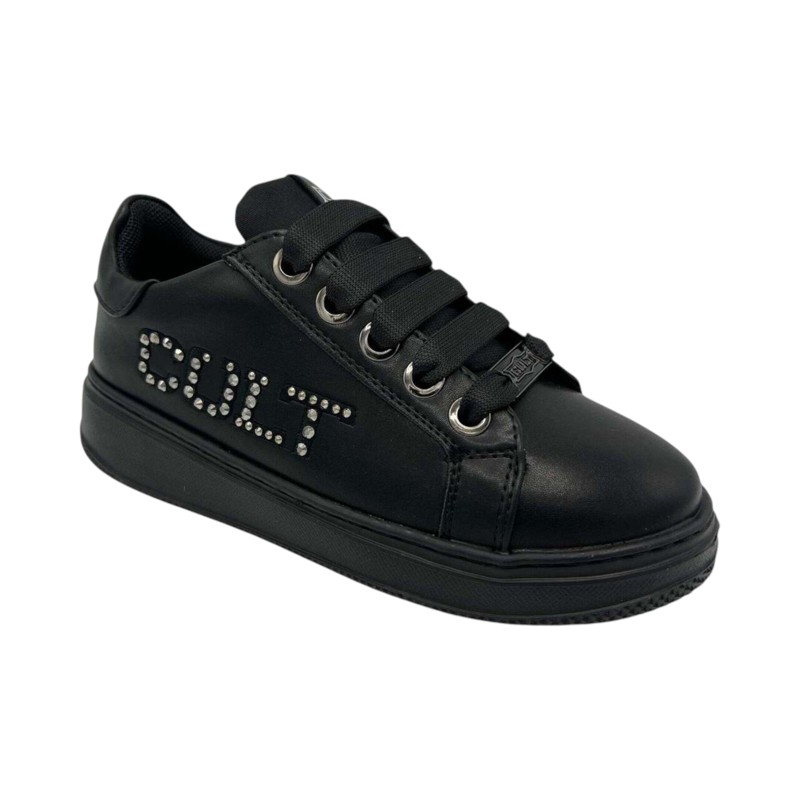 Sneakers in similpelle, linguetta con patch logo, chiusura con lacci, logo lettering con borchiette laterali, punta tonda, suola in gomma.