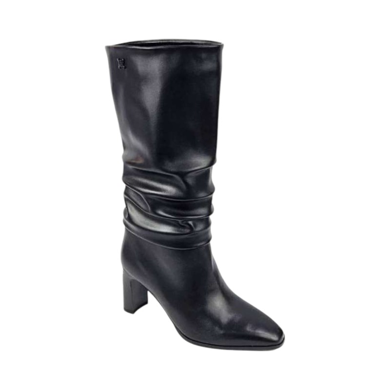 Stivale in similpelle, gambale alto, puntale ovale, tacco alto.
