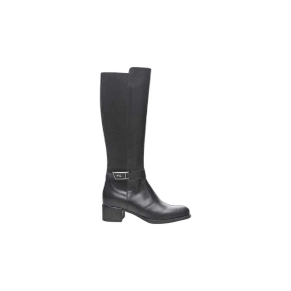 Stivale alto in vera pelle, punta tonda, fettuccia con dettaglio in metallo, chiusura con zip laterale, tallone rinforzato, suola in gomma.