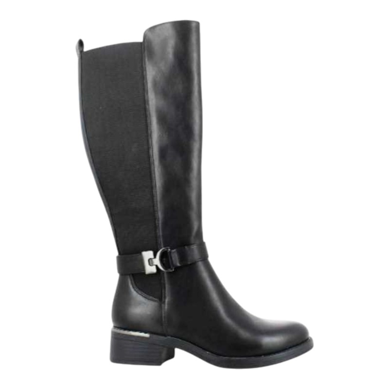 Stivale in similpelle, gambale alto, bande laterali elasticizzate, fettuccia laterale con fibbia in metallo, punta tonda, tallone rinforzato, suola in gomma.