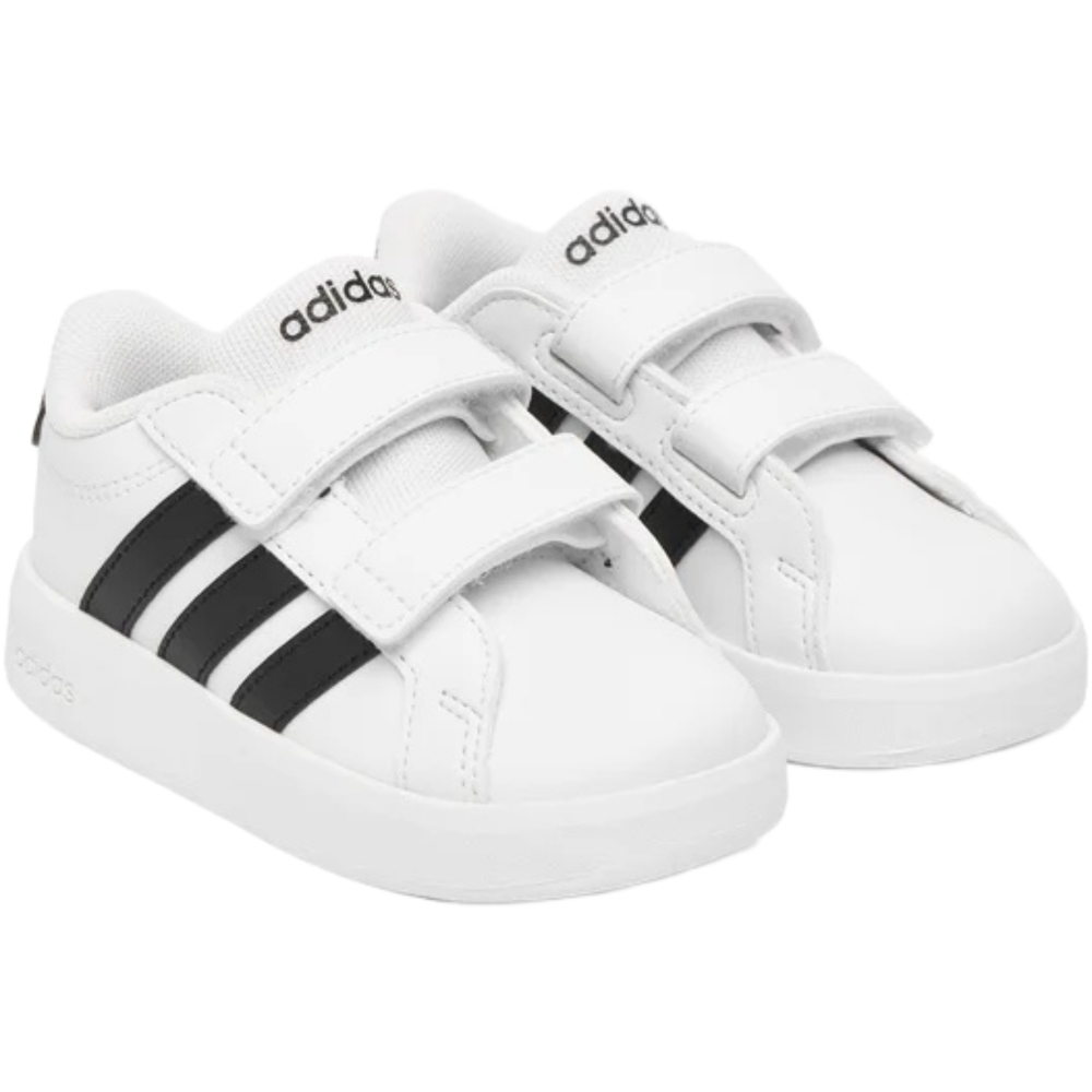 Le sneaker adidas Grandcourt 3.0 CF I da infant in bianco e nero sono perfette per i più piccoli, con uno stile ispirato al tennis facile da abbinare ogni giorno. La tomaia in pelle sintetica offre un look pulito e una buona resistenza, mentre la chiusura a strappo rende la calzata pratica e veloce per gioco, asilo e tempo libero.