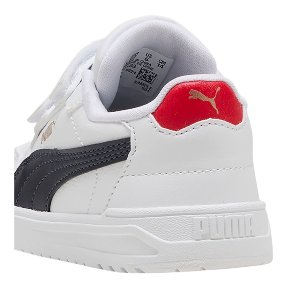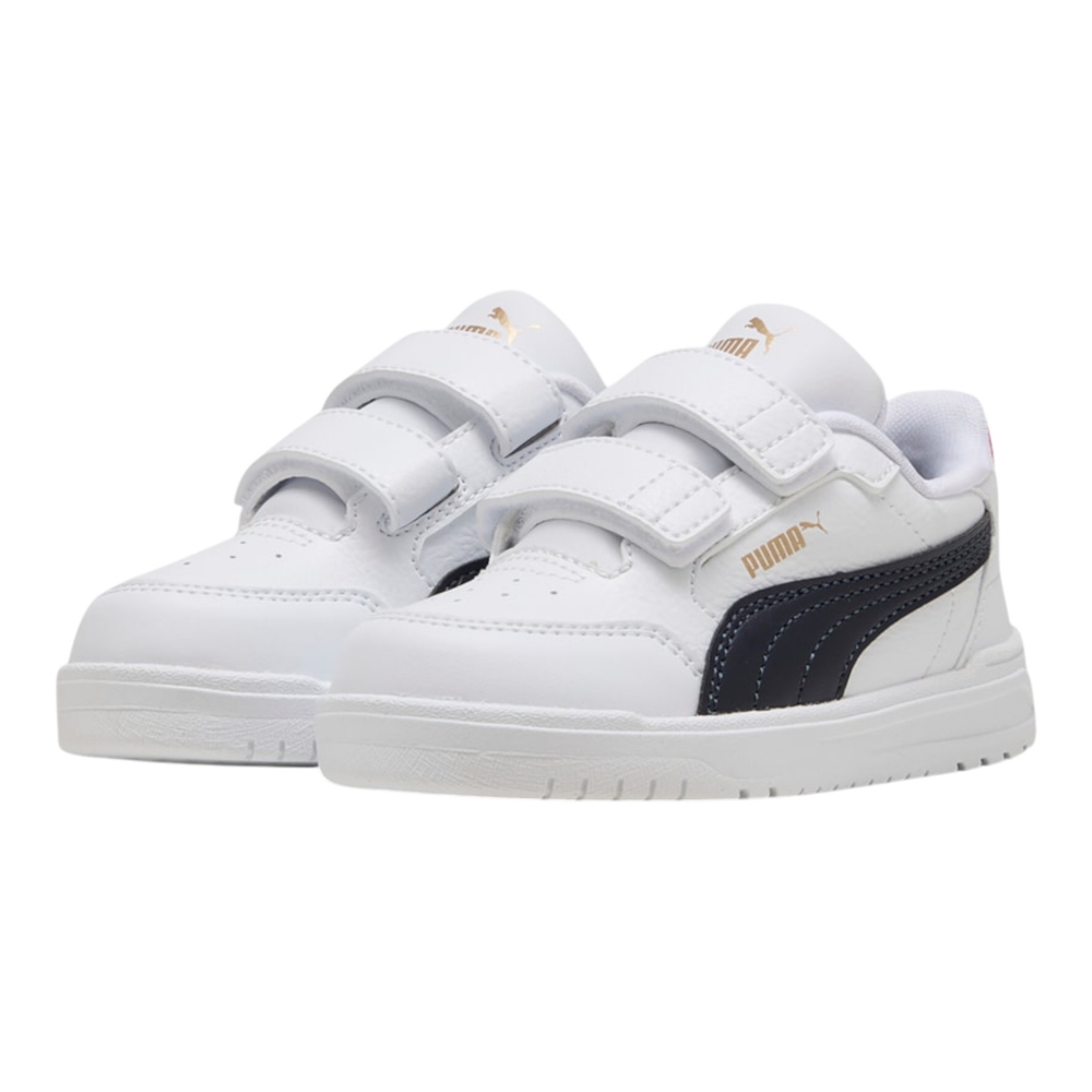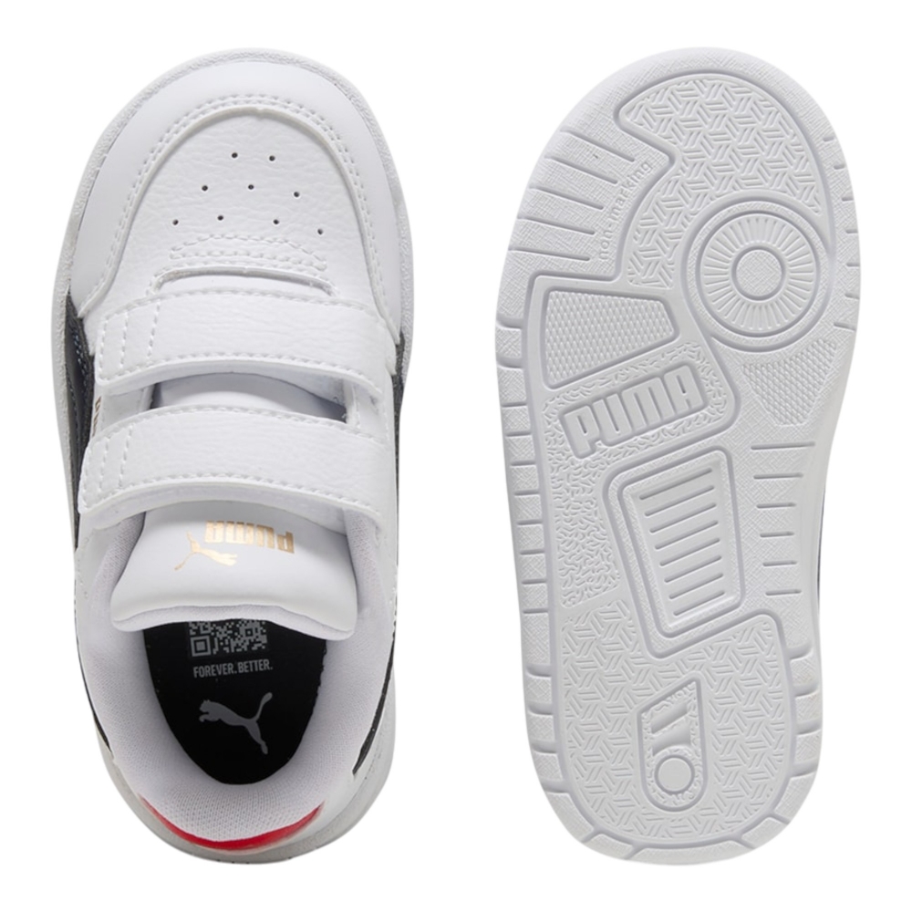 Le Puma Shuffle 03 da neonato reinterpretano il classico stile sportivo del brand in una versione confortevole e pratica, pensata per i più piccoli. Realizzate in pelle sintetica liscia, offrono una calzata morbida e resistente, perfetta per accompagnare i primi passi con stabilità e sicurezza. Il design in bianco con dettagli blu navy e rossi richiama l’inconfondibile estetica Puma, fresca e vivace, facilmente abbinabile a qualsiasi outfit quotidiano. La suola in gomma antiscivolo assicura aderenza e protezione, mentre la chiusura con strap a strappo facilita la calzata e rende queste sneakers ideali per i bambini in movimento. Un modello versatile, comodo e dal look intramontabile, perfetto per ogni occasione informale.