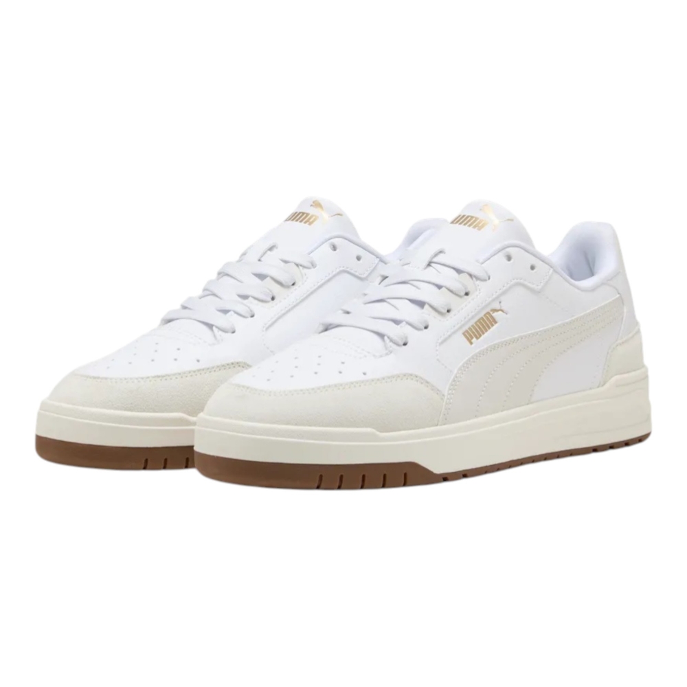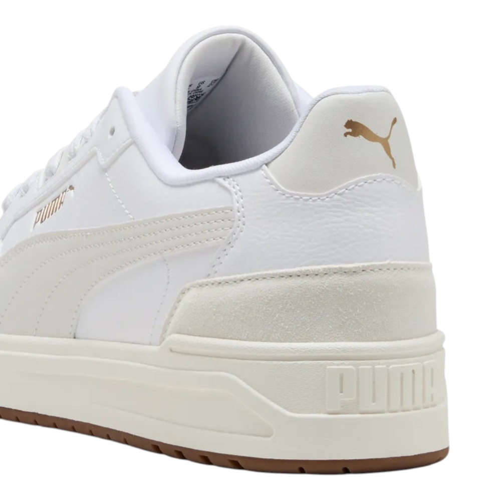 Sneakers Puma in similpelle con inserti effetto suede, perfette per il tempo libero e per un look sportivo dal gusto urbano. Il mix di bianco, vapor gray e dettagli gold dona alla scarpa uno stile moderno e versatile, facile da abbinare a diversi outfit casual. Un modello comodo e dal design contemporaneo, ideale per chi cerca praticità e carattere in ogni occasione.