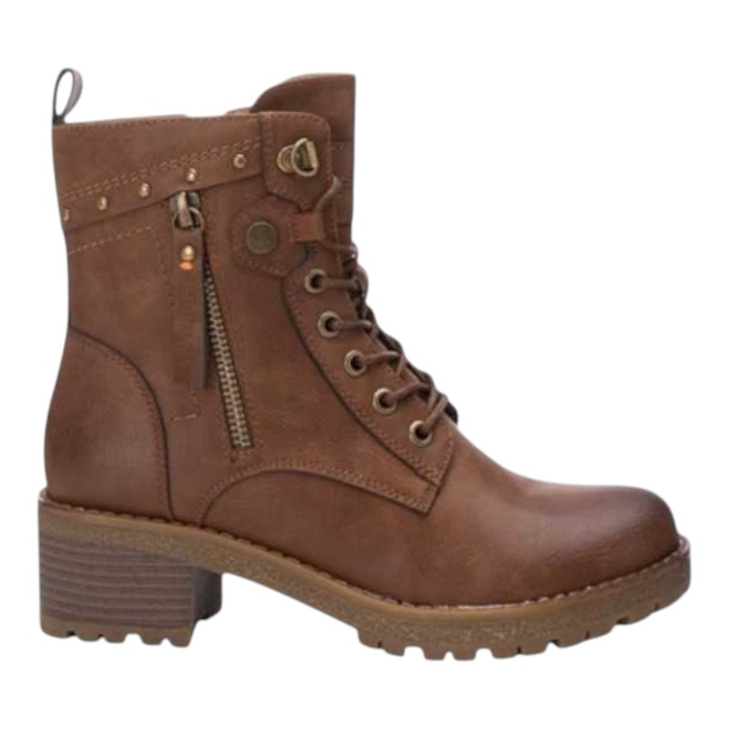 Tronchetto in similpelle, linguetta, chiusura con lacci, zip laterale, tallone rinforzato, suola in gomma.