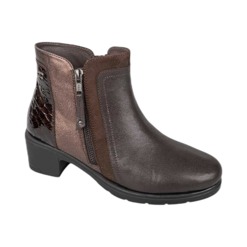 Tronchetto in vera pelle e suede, chiusura con zip laterale, punta tonda, tallone rinforzato con dettaglio in vernice, suola in gomma.