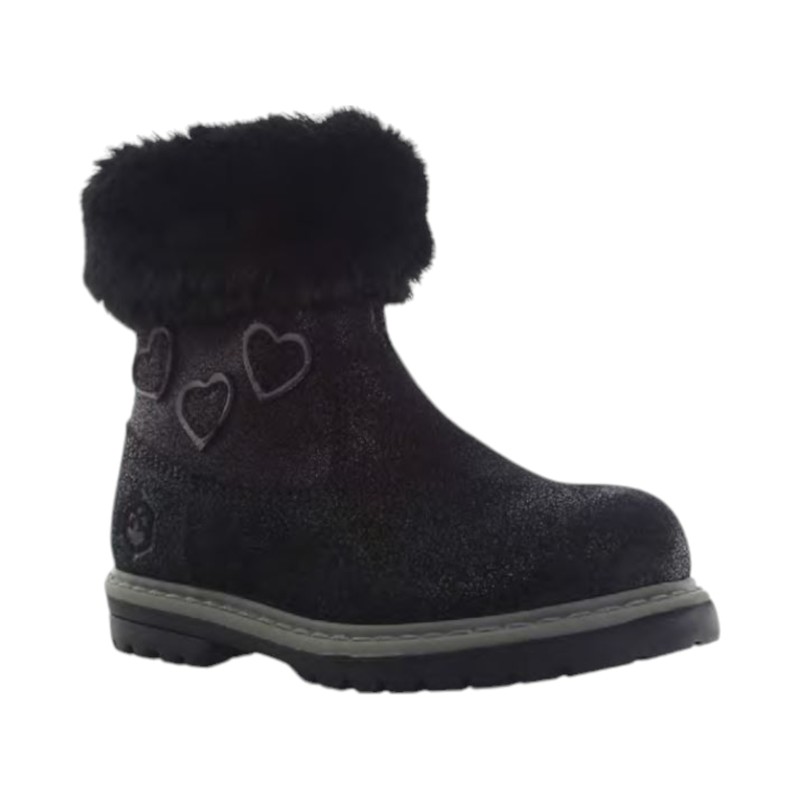 Stivaletto in pelle scamosciata, cuori ricamati a contrasto, banda in pelliccia sintetica applicata, chiusura con zip laterali e fettuccia in velcro, suola in gomma.