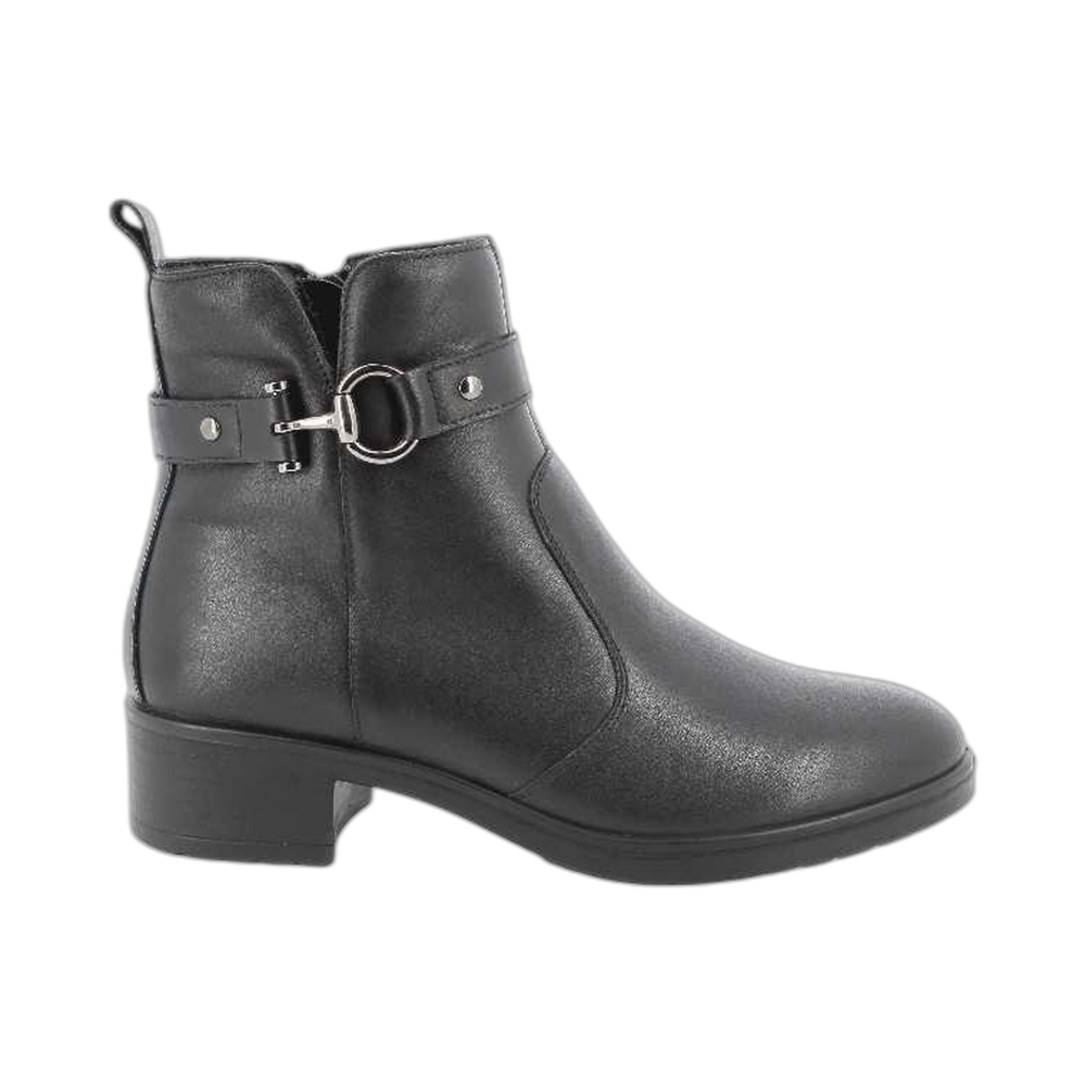 Tronchetto in vera pelle nappa, punta tonda, fettuccia laterale con fibbia, tallone rinforzato, suola in gomma.