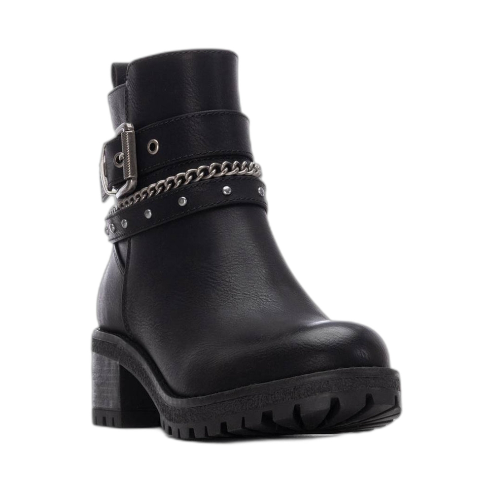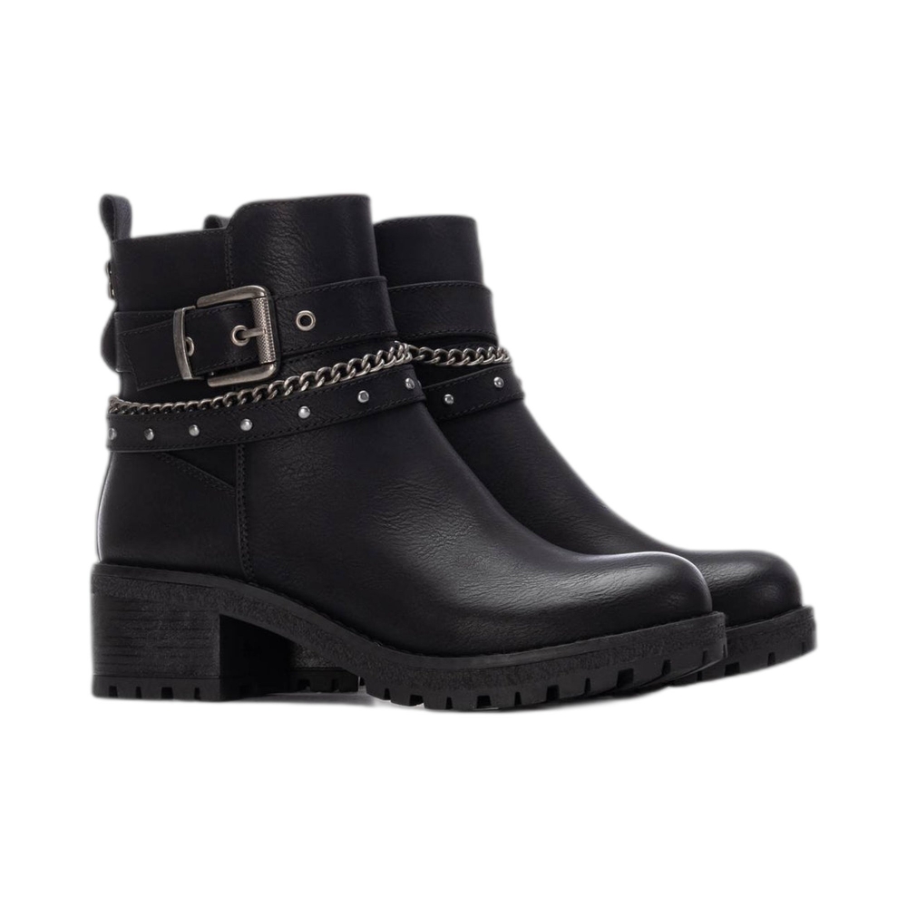 Tronchetto in similpelle, fettuccia con fibbia, punta tonda, tallone rinforzato, suola in gomma.