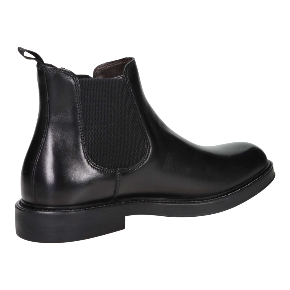 Tronchetto in pelle di vitello, punta tonda, bande laterali elasticizzate, tallone rinforzato, suola in gomma.