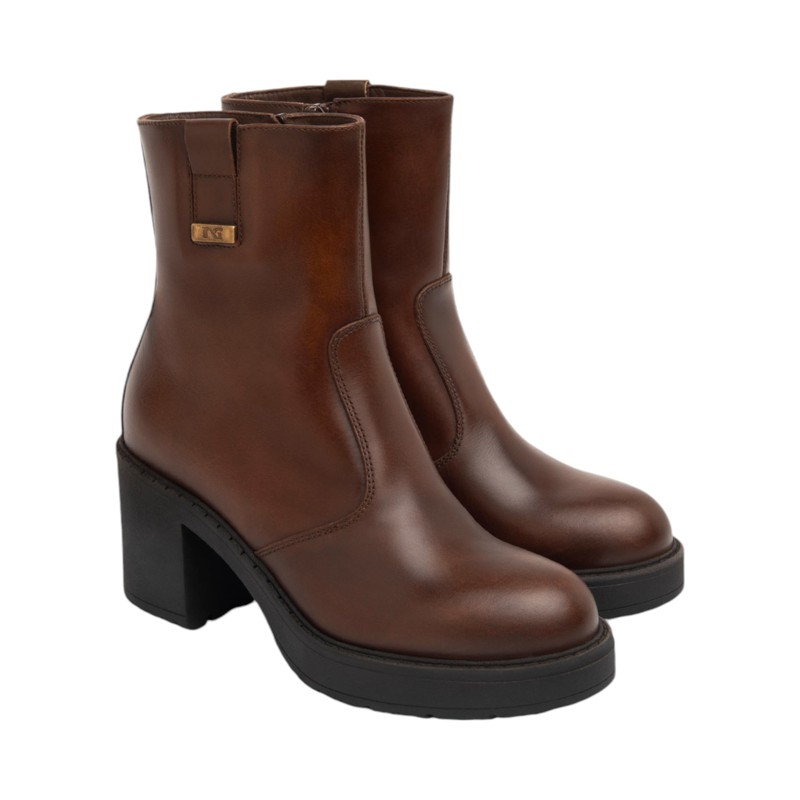 Tronchetto in vera pelle, fettuccia con logo inciso laterale, punta tonda, tallone rinforzato, suola in gomma con tacco a blocco, Made in Italy.