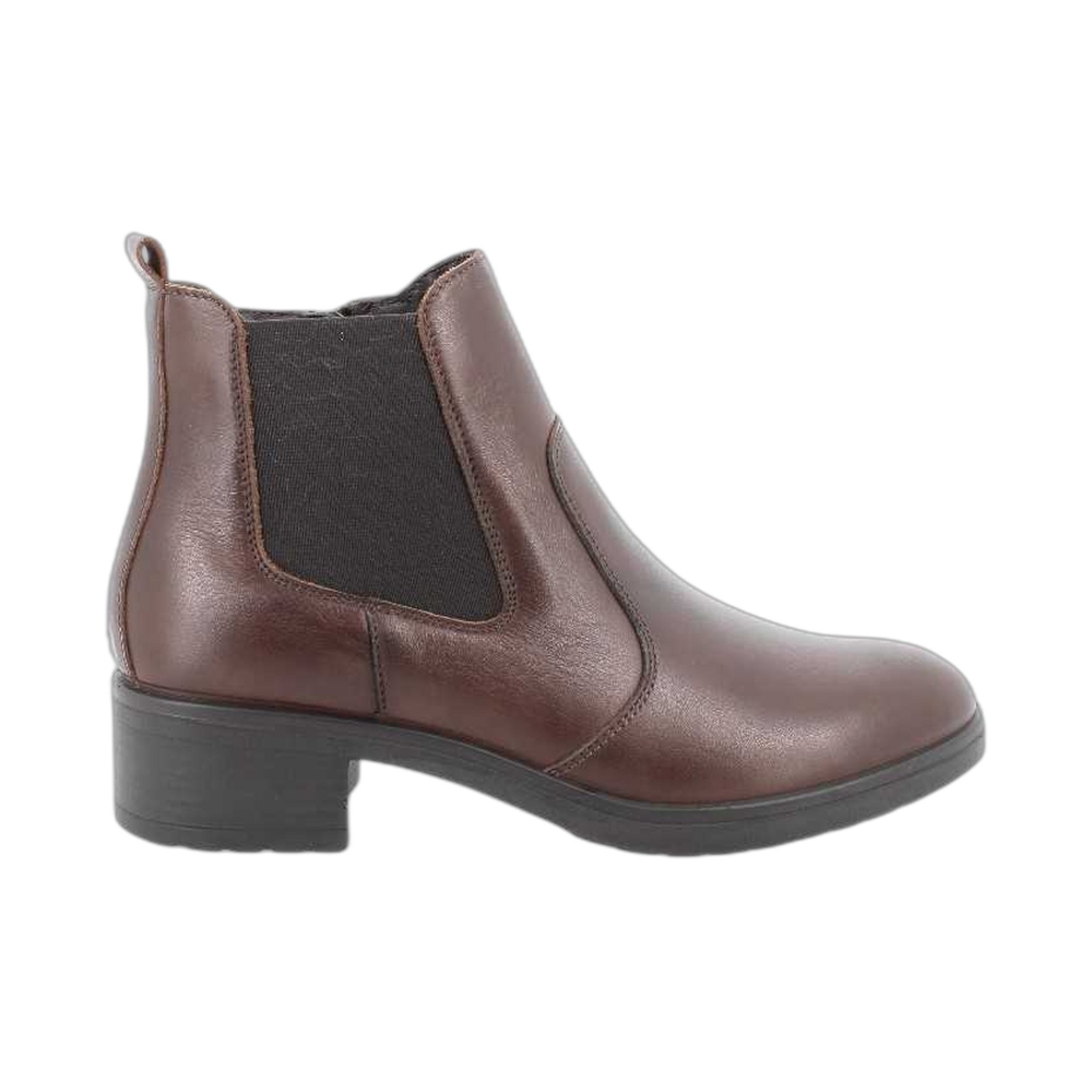 Tronchetto in vera pelle, punta tonda, bande laterali elasticizzate, tallone rinforzato, suola con tacco medio.