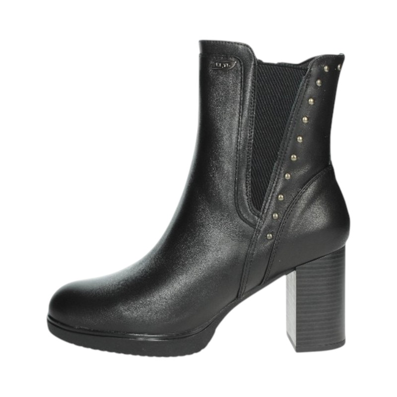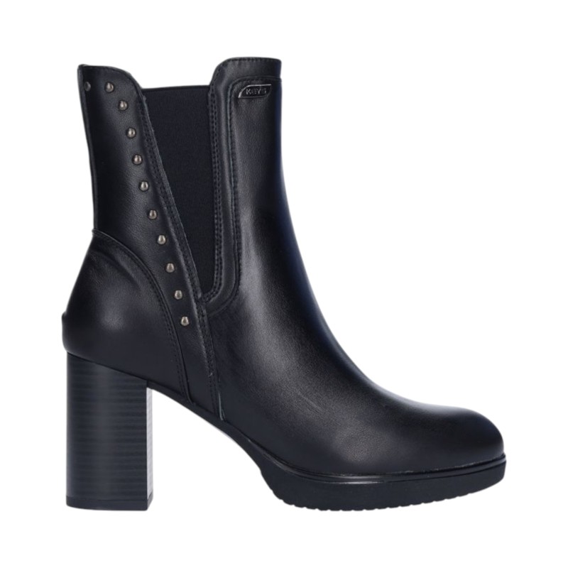 Tronchetto in similpelle, borchiette applicate, bande laterali elasticizzate, punta tonda, tallone rinforzato, suola con tacco alto.