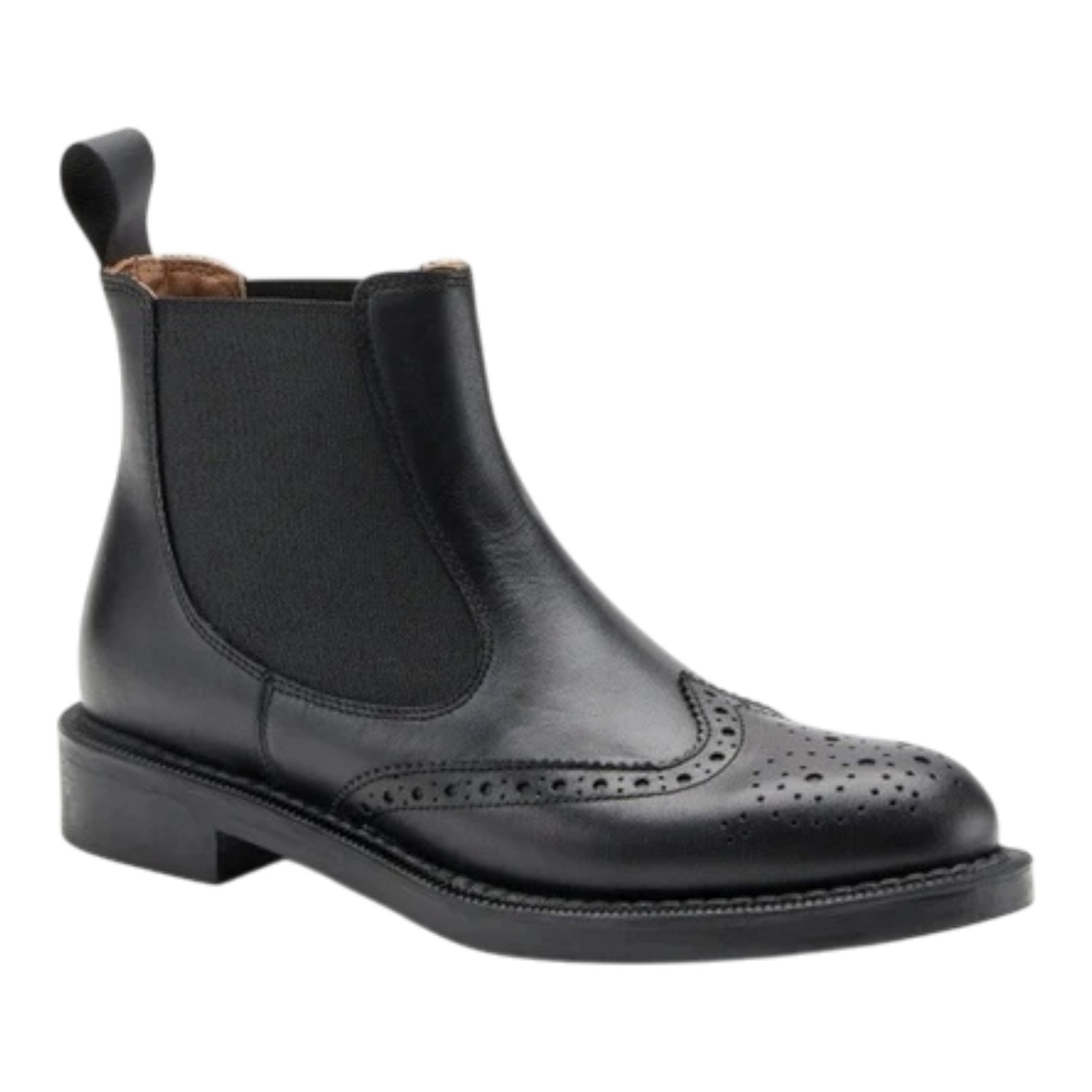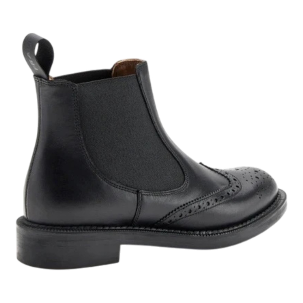 Tronchetto beatles in vera pelle, punta tonda con dettagli a coda di rondine, bande laterali elasticizzate, tallone rinforzato, tirante posteriore, suola in gomma.