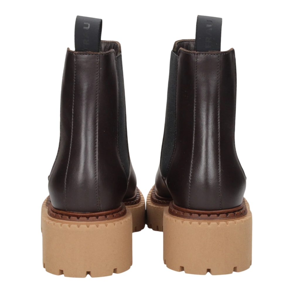 Tronchetto in vera pelle, bande laterali elasticizzate, punta tonda, tirante posteriore, tallone rinfozato, suola in gomma a trattore.