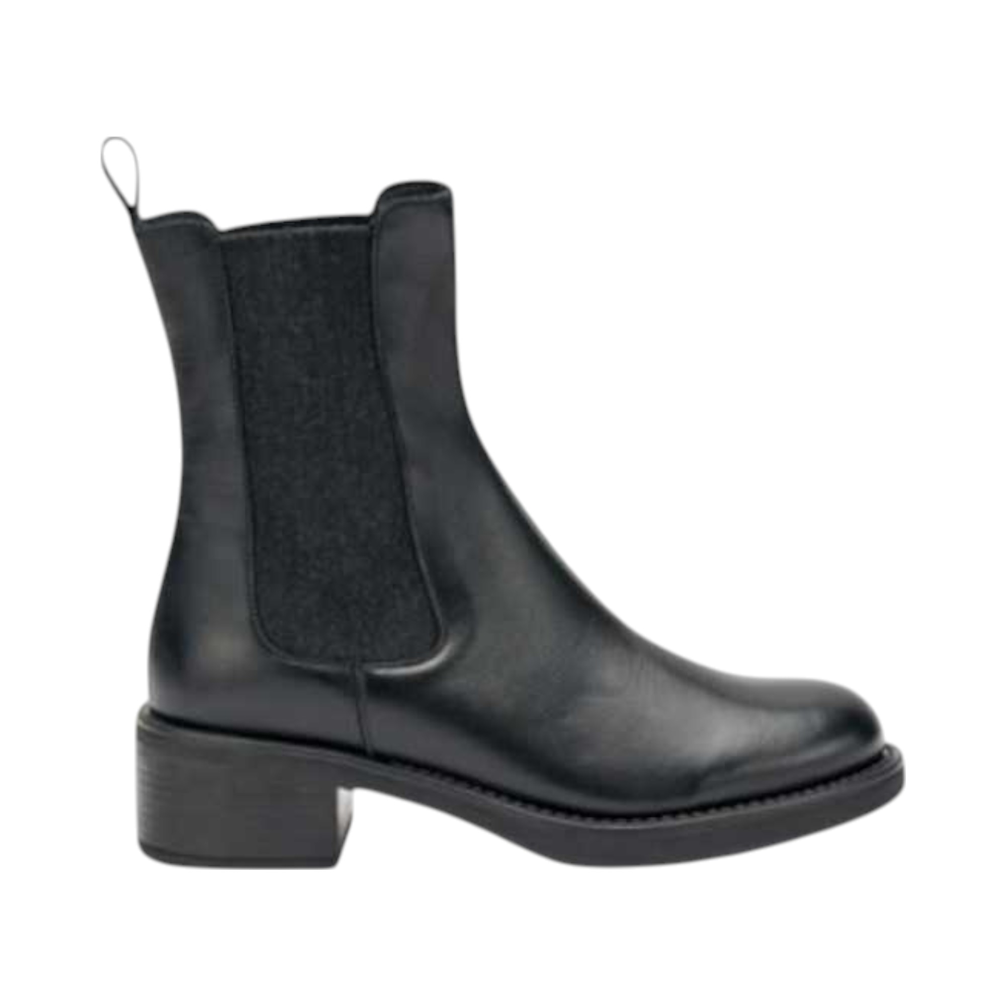 Tronchetto in vera pelle, punta tonda, bande laterali elasticizzate, tallone rinforzato, suola con tacco.