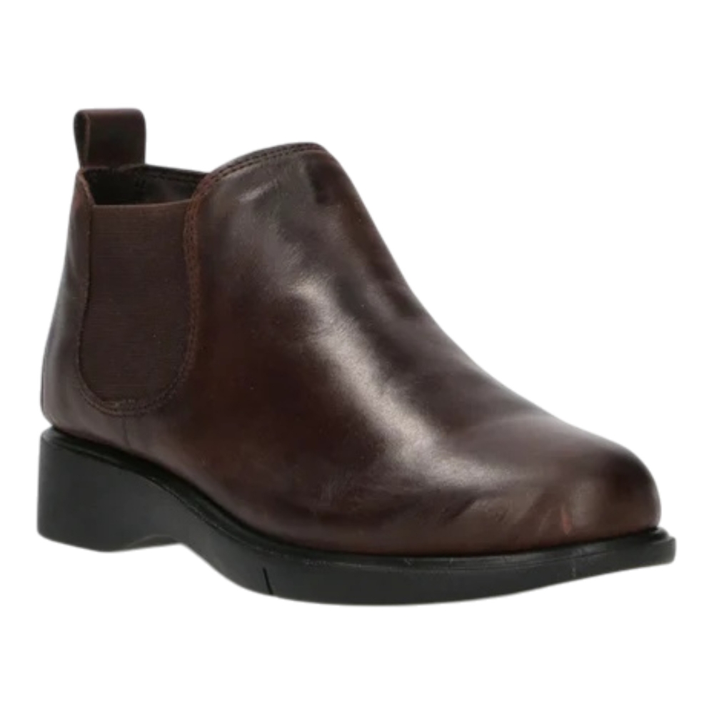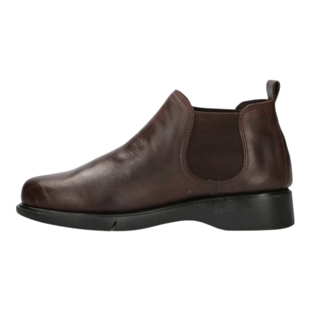 Tronchetto in vera pelle, bande laterali elasticizzate, tallone rinforzato con tirante posteriore, suola in gomma.