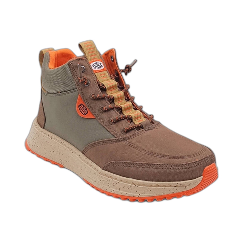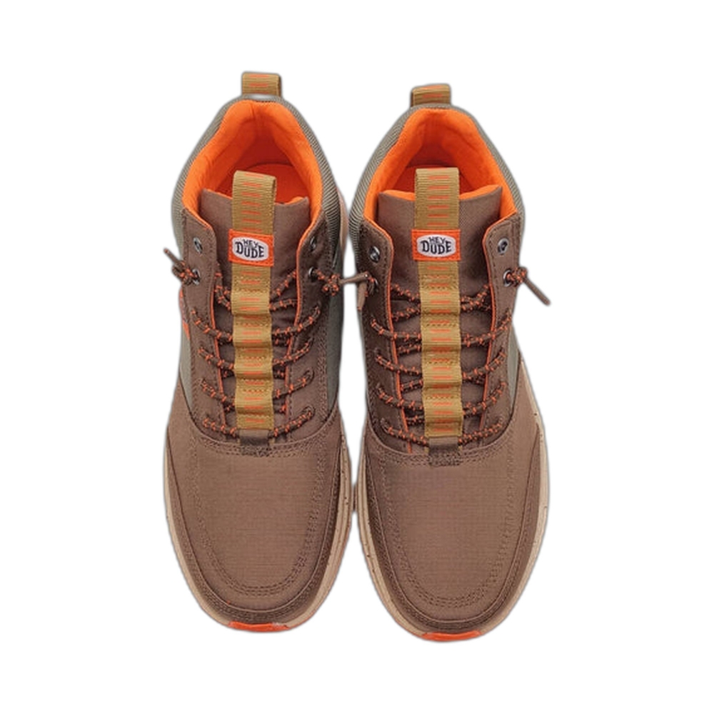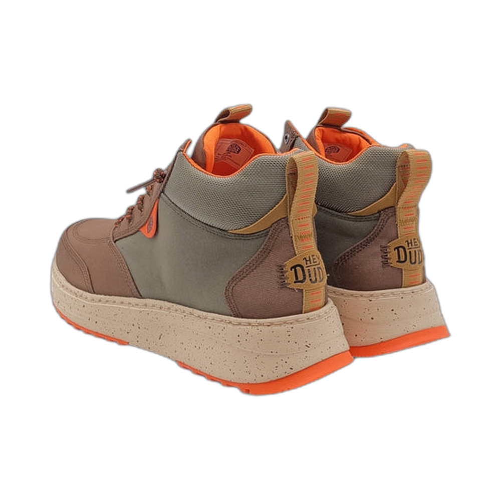Polacchino in nylon, tomaia trattata con spray idrorepellente, tallone con laccetto che facilita la calzata, lacci elastici con ferma-lacci, sistema Easy-on, soletta in schiuma rimovibile, suola antiscivolo in gomma con tacchetti.